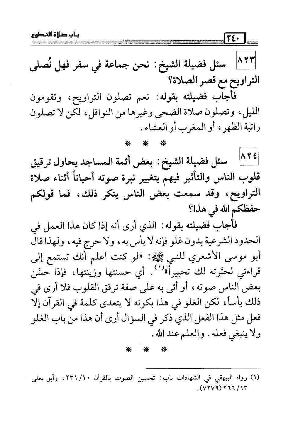 823 سئل فضيلة الشيخ: نحن جماعة في سفر فهل نصلى التراويح مع قصر الصلاة؟