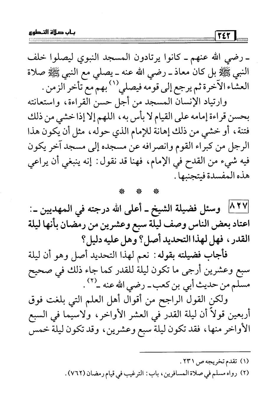 فأجاب فضيلته بقوله: نعم لهذا التحديد أصل وهو أن ليلة سبع وعشرين أرجى ما تكون ليلة للقدر كما جاء ذلك في صحيح مسلم من حديث أبي بن كعب – رضي الله عنه - (¬2) .