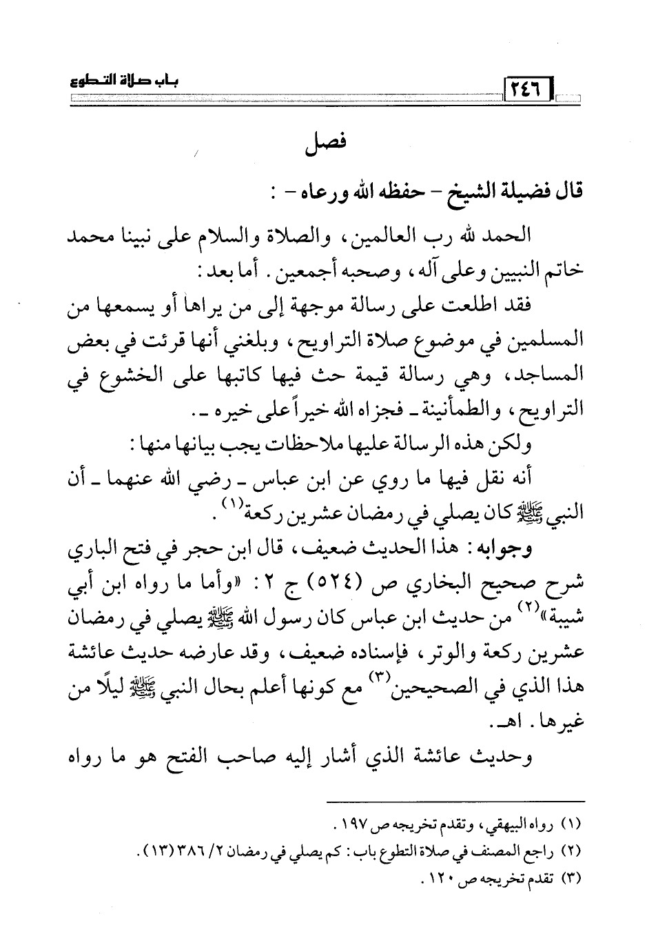 وجوابه: هذا الحديث ضعيف، قال ابن حجر في فتح الباري شرح صحيح البخاري ص (524) ج2: "وأما ما رواه ابن أبي شيبة" (¬2) من حديث ابن عباس كان رسول الله صَلَّى اللَّهُ عَلَيْهِ وَسَلَّمَ يصلي في رمضان عشرين ركعة والوتر، فإسناده ضعيف، وقد عارضه حديث عائشة هذا الذي في الصحيحين (¬3) مع كونها أعلم بحال النبي صَلَّى اللَّهُ عَلَيْهِ وَسَلَّمَ ليلاً من غيرها. أهـ.