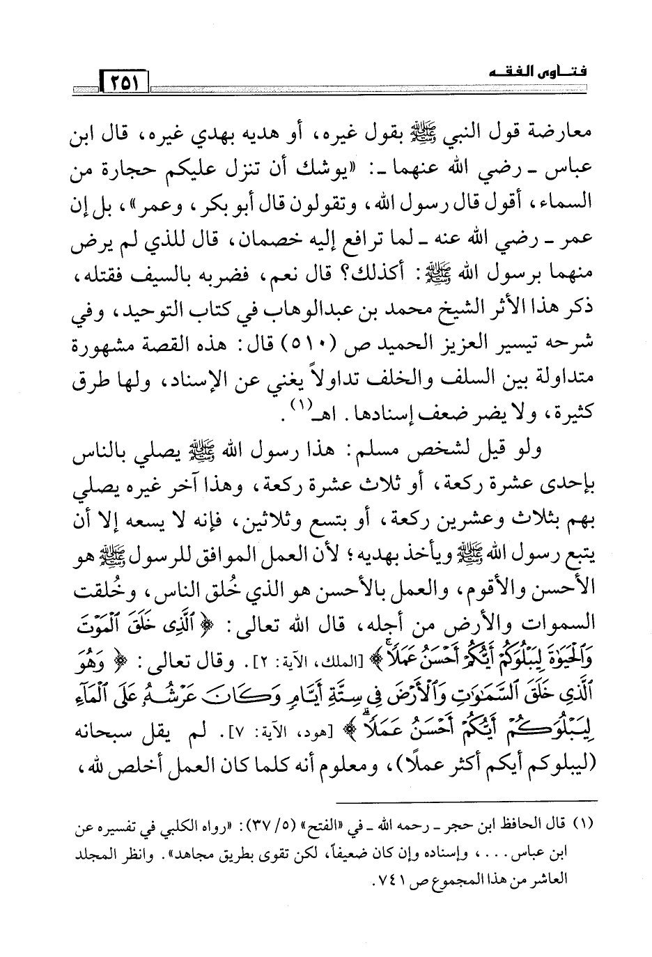 ولو قيل لشخص مسلم: هذا رسول الله صَلَّى اللَّهُ عَلَيْهِ وَسَلَّمَ يصلي بالناس بإحدى عشرة ركعة، أو ثلاث عشرة ركعة، وهذا آخر غيره يصلي بهم بثلاث وعشرين ركعة، أو بتسع وثلاثين، فإنه لا يسعه إلا أن يتبع رسول الله صَلَّى اللَّهُ عَلَيْهِ وَسَلَّمَ ويأخذ بهديه؛ لأن العمل الموافق للرسول صَلَّى اللَّهُ عَلَيْهِ وَسَلَّمَ هو الأحسن والأقوم، والعمل بالأحسن هو الذي خلق الناس، وخلقت السموات والأرض من أجله، قال الله تعالى: (الَّذِي خَلَقَ الْمَوْتَ وَالْحَيَاةَ لِيَبْلُوَكُمْ أَيُّكُمْ أَحْسَنُ عَمَلاً) (الملك: 2) . وقال تعالى: (وَهُوَ الَّذِي خَلَقَ السَّمَاوَاتِ وَالْأَرْضَ فِي سِتَّةِ أَيَّامٍ وَكَانَ عَرْشُهُ عَلَى الْمَاءِ لِيَبْلُوَكُمْ أَيُّكُمْ أَحْسَنُ عَمَلاً) (هود: 7) . لم يقل سبحانه (ليبلوكم أكثر عملاً) ، ومعلوم أنه كلما كان العمل أخلص لله،