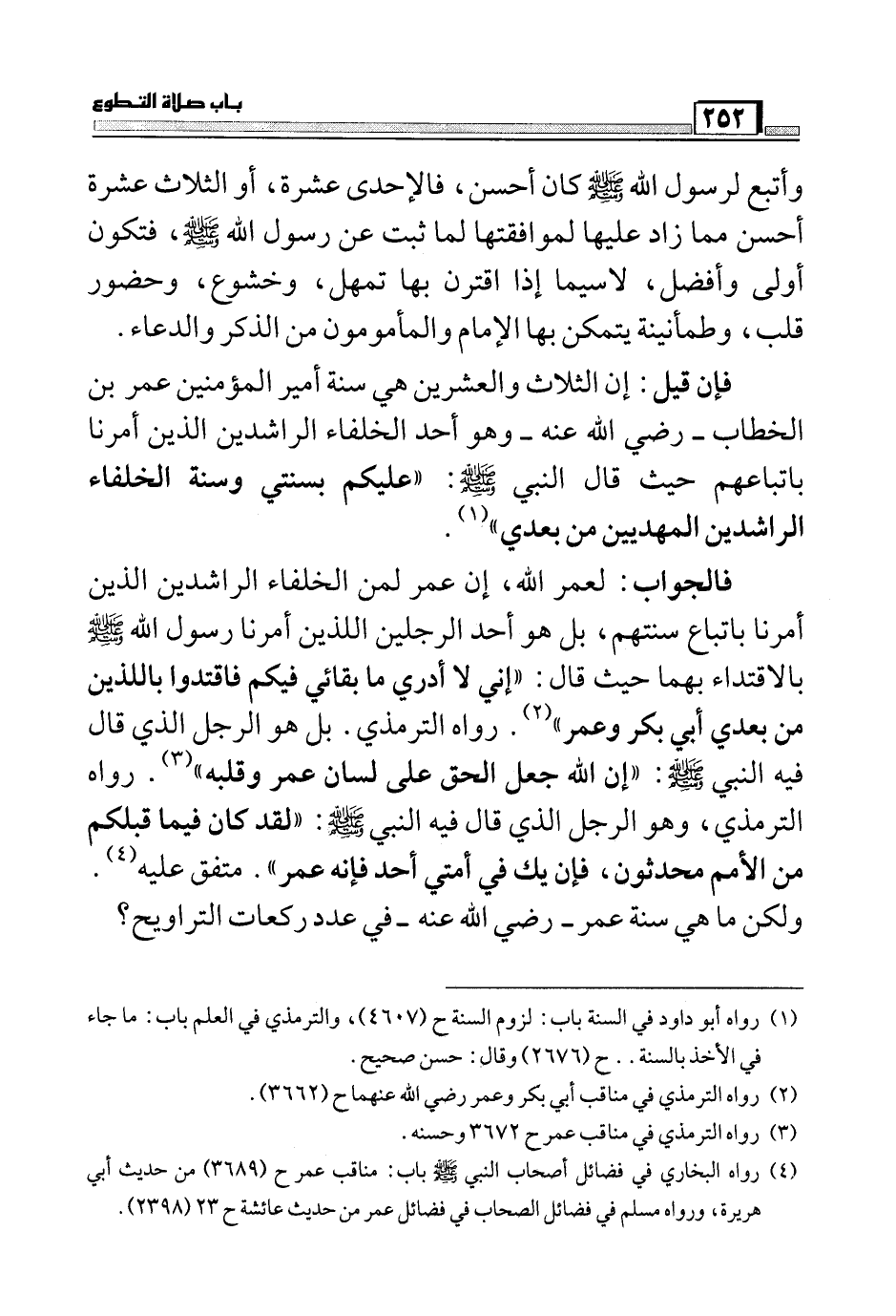 فالجواب: لعمر الله، إن عمر لمن الخلفاء الراشدين الذين أمرنا باتباع سنتهم، بل هو أحد الرجلين اللذين أمرنا رسول الله صَلَّى اللَّهُ عَلَيْهِ وَسَلَّمَ بالاقتداء بهما حيث قال: "إني لا أدري ما بقائي فيكم فاقتدوا باللذين من بعدي أبي بكر وعمر" (¬2) . رواه الترمذي. بل هو الرجل الذي قال فيه النبي صَلَّى اللَّهُ عَلَيْهِ وَسَلَّمَ: "إن الله جعل الحق على لسان عمر وقلبه" (¬3) . رواه الترمذي، وهو الرجل الذي قال فيه النبي صَلَّى اللَّهُ عَلَيْهِ وَسَلَّمَ: "لقد كان فيما قبلكم من الأمم محدثون، فإن بك في أمتي أحد فإنه عمر". متفق عليه (¬4) . ولكن ما هي سنة عمر – رضي الله عنه – في عدد ركعات التراويح؟