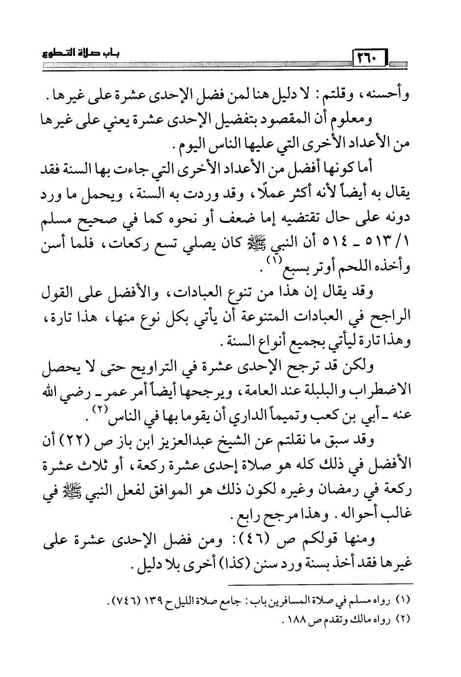 ومنها قولكم ص (46) : ومن فضل الإحدى عشرة على غيرها فقد أخذ بسنة ورد سنن (كذا) أخرى بلا دليل.