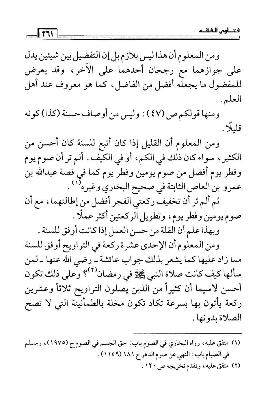 ومن المعلوم أن هذا ليس بلازم بل إن التفضيل بين شيئين يدل على جوازهما مع رجحان أحدهما على الآخر، وقد يعرض للمفضول ما يجعله أفضل من الفاضل، كما هو معروف عند أهل العلم.