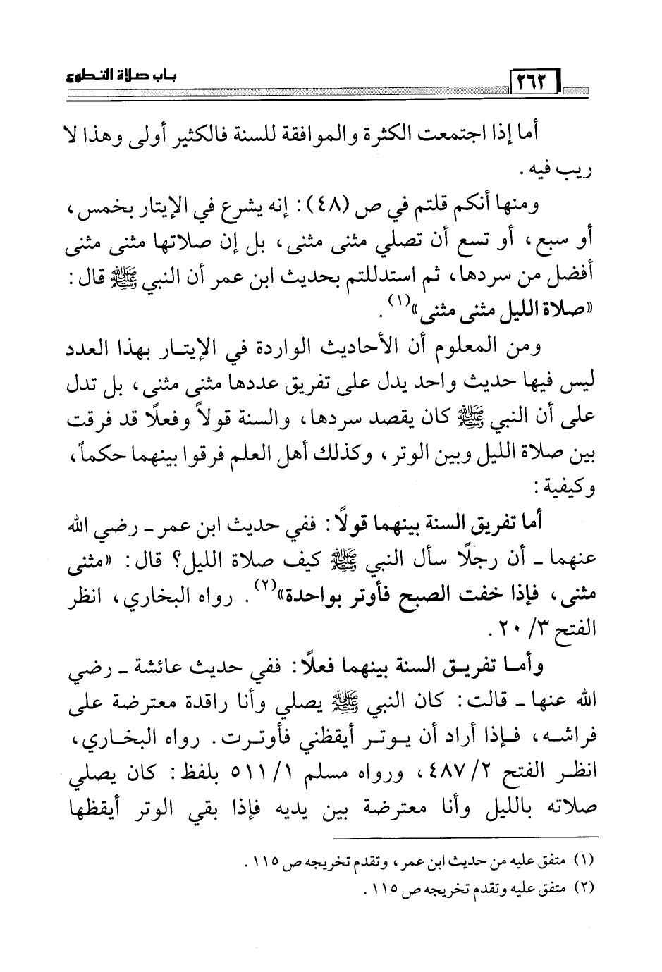 ومنها أنكم قلتم في ص (48) : إنه يشرع في الإيتار بخمس، أو سبع، أو تسع أن تصلي مثنى مثنى، بل إن صلاتها مثنى مثنى أفضل من سردها، ثم استدللتم بحديث ابن عمر أن النبي صَلَّى اللَّهُ عَلَيْهِ وَسَلَّمَ قال: "صلاة الليل مثنى مثنى" (¬1) .