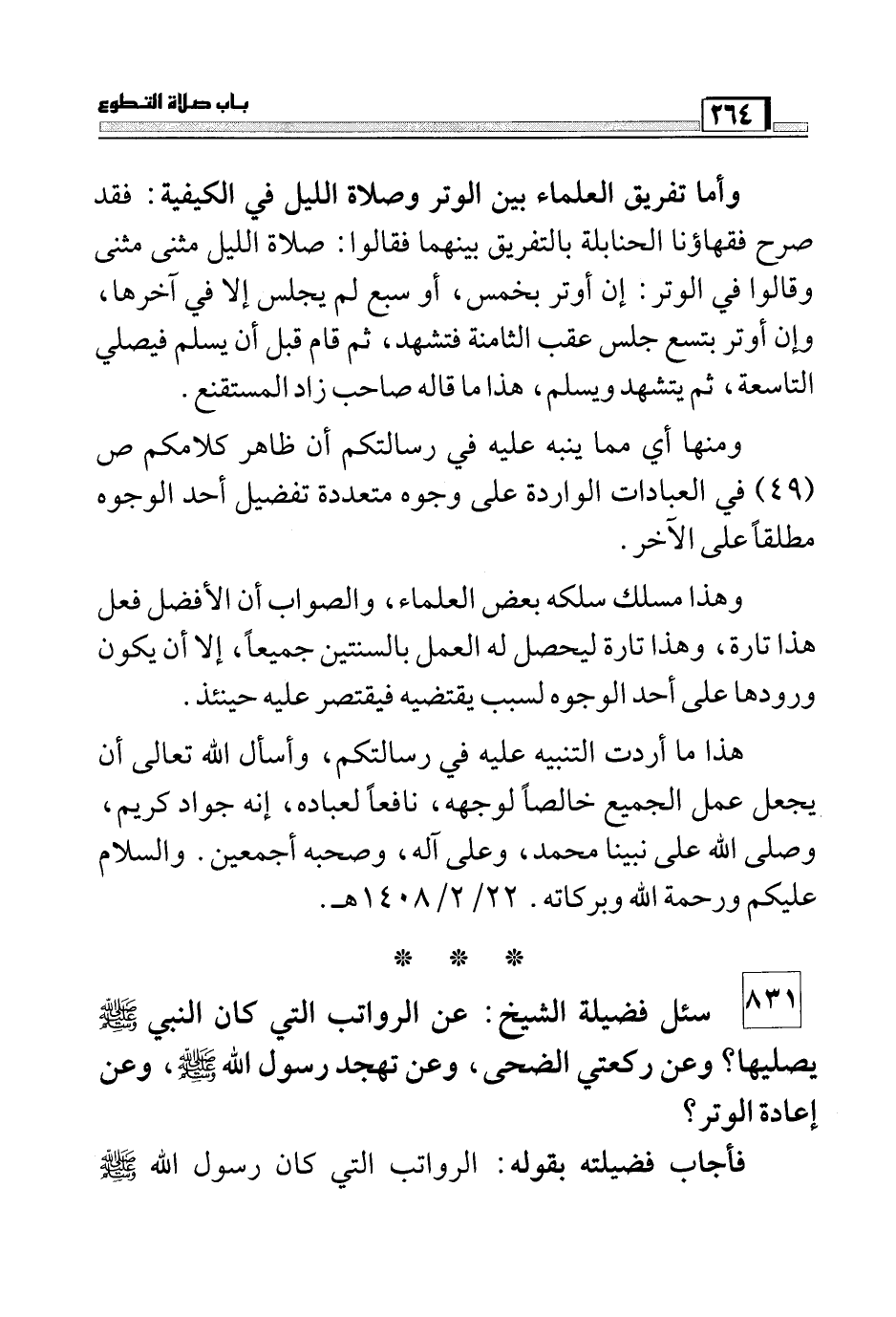 831 سئل فضيلة الشيخ: عن الرواتب التي كان النبي صَلَّى اللَّهُ عَلَيْهِ وَسَلَّمَ يصليها؟ وعن ركعتي الضحى، وعن تهجد رسول الله صَلَّى اللَّهُ عَلَيْهِ وَسَلَّمَ، وعن إعادة الوتر؟