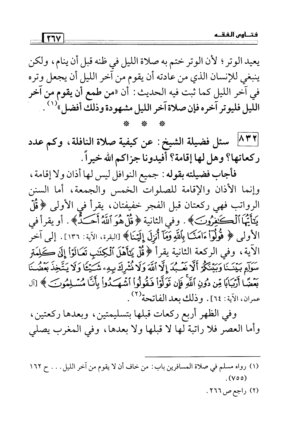 فأجاب فضيلته بقوله: جميع النوافل ليس لها أذان ولا إقامة، وإنما الأذان والإقامة للصلوات الخمس والجمعة، أما السنن الرواتب فهي ركعتان قبل الفجر خفيفتان، يقرأ في الأولى (قُلْ يَا أَيُّهَا الْكَافِرُونَ) . وفي الثانية (قُلْ هُوَ اللَّهُ أَحَدٌ) . أو يقرأ في الأولى (قُولُوا آمَنَّا بِاللَّهِ وَمَا أُنْزِلَ إِلَيْنَا) (البقرة، الآية: 136) . إلى آخر الآية، وفي الركعة الثانية يقرأ (قُلْ يَا أَهْلَ الْكِتَابِ تَعَالَوْا إِلَى كَلِمَةٍ سَوَاءٍ بَيْنَنَا وَبَيْنَكُمْ أَلَّا نَعْبُدَ إِلَّا اللَّهَ وَلا نُشْرِكَ بِهِ شَيْئاً وَلا يَتَّخِذَ بَعْضُنَا بَعْضاً أَرْبَاباً مِنْ دُونِ اللَّهِ فَإِنْ تَوَلَّوْا فَقُولُوا اشْهَدُوا بِأَنَّا مُسْلِمُونَ) (آل عمران: 64) . وذلك بعد الفاتحة (¬2) .