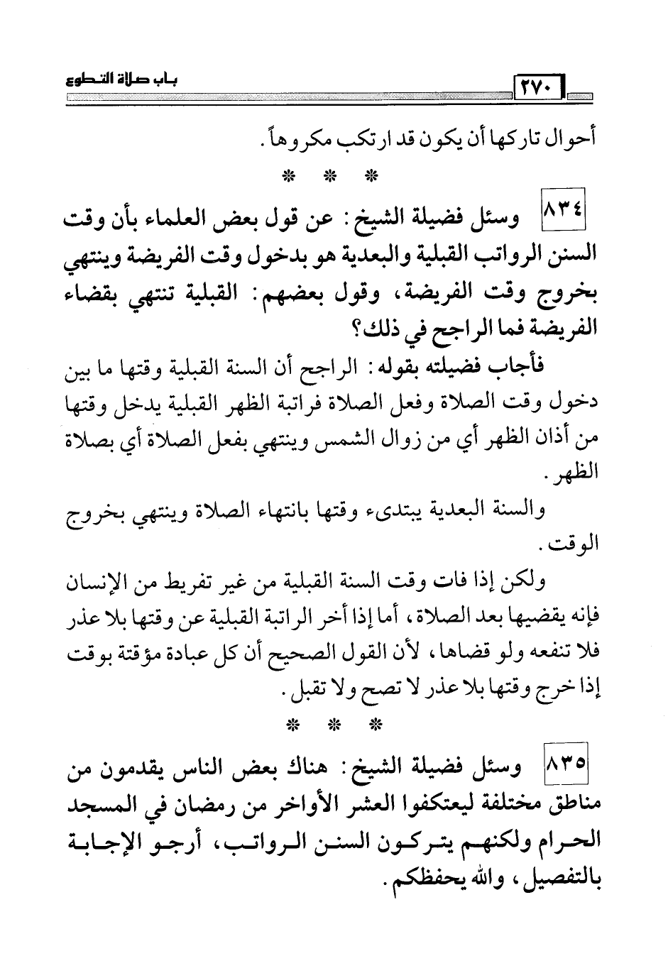 834 وسئل فضيلة الشيخ: عن قول بعض العلماء بأن وقت السنن الرواتب القبلية والبعدية هو بدخول وقت الفريضة وينتهي بخروج وقت الفريضة، وقول بعضهم، القبلية تنتهي بقضاء الفريضة فما الراجح في ذلك؟