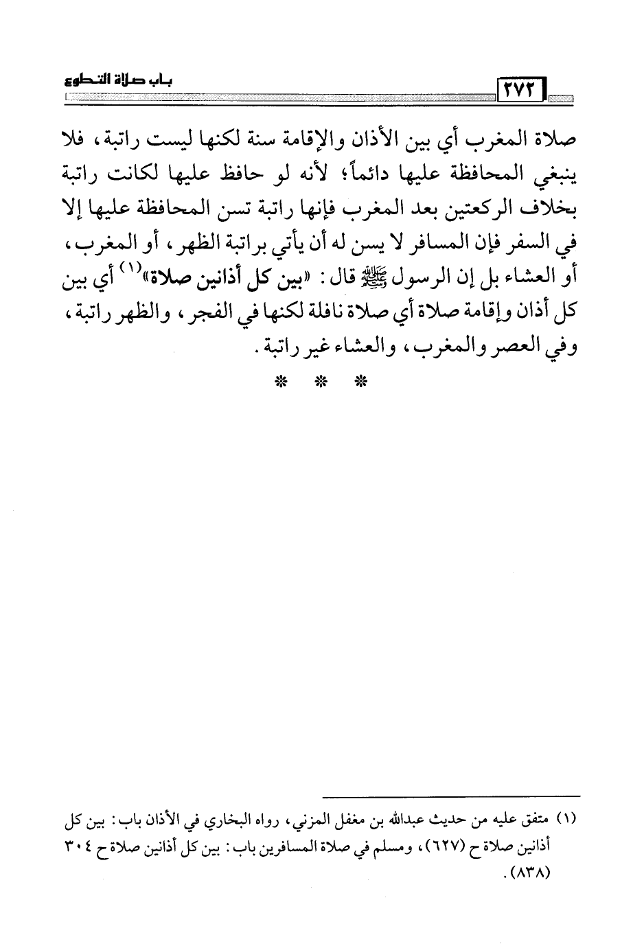 صلاة المغرب أي بين الأذان والإقامة سنة لكنها ليست راتبة، فلا ينبغي المحافظة عليها دائماً؛ لأنه لو حافظ عليها لكانت راتبة بخلاف الركعتين بعد المغرب فإنها راتبة تسن المحافظة عليها إلا في السفر فإن المسافر لا يسن له أن يأتي براتبة الظهر، أو المغرب، أو العشاء بل إن الرسول صَلَّى اللَّهُ عَلَيْهِ وَسَلَّمَ قال: "بين كل أذانين صلاة" (¬1) أي بين كل أذان وإقامة صلاة أي صلاة نافلة لكنها في الفجر، والظهر راتبة، وفي العصر والمغرب، والعشاء غير راتبة.