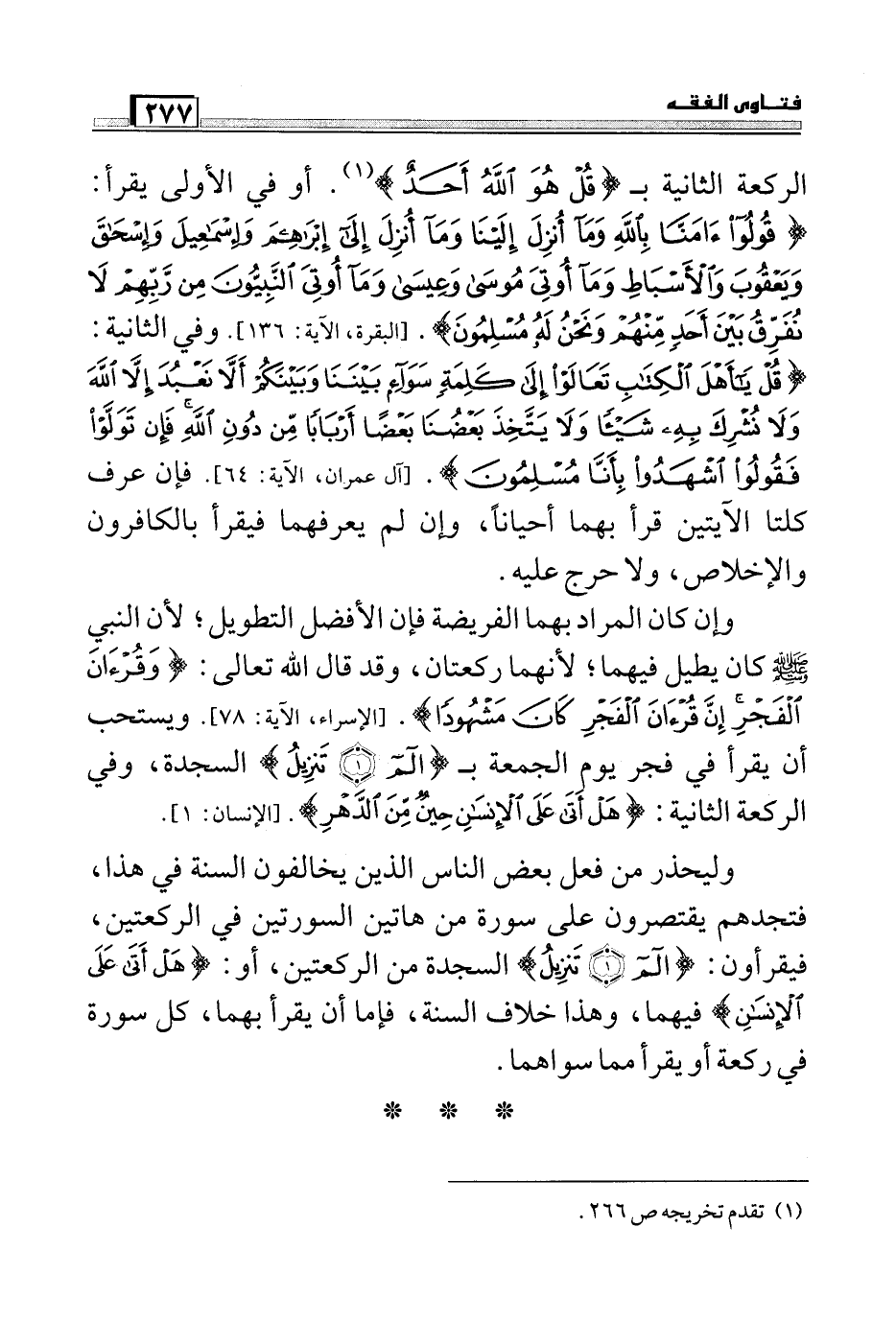 وليحذر من فعل بعض الناس الذين يخالفون السنة في هذا، فنجدهم يقتصرون على سورة من هاتين السورتين في الركعتين، فيقرأون: (الم* تَنْزِيل) السجدة من الركعتين: أو: (هَلْ أَتَى عَلَى الْأِنْسَانِ) فيهما، وهذا خلاف السنة، فإما أن يقرأ بهما، كل سورة في ركعة أو يقرا مما سواهما.