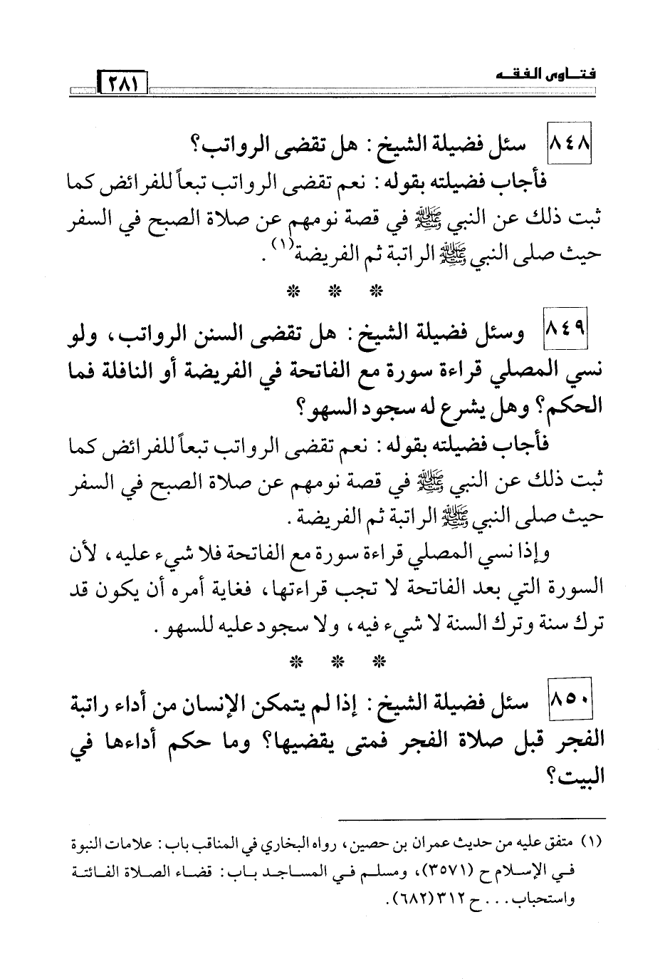 فأجاب فضيلته بقوله: نعم تقضى الرواتب تبعاً للفرائض كما ثبت ذلك عن النبي صَلَّى اللَّهُ عَلَيْهِ وَسَلَّمَ في قصة نومهم عن صلاة الصبح في السفر حيث صلى النبي صَلَّى اللَّهُ عَلَيْهِ وَسَلَّمَ الراتبة ثم الفريضة (¬1) .