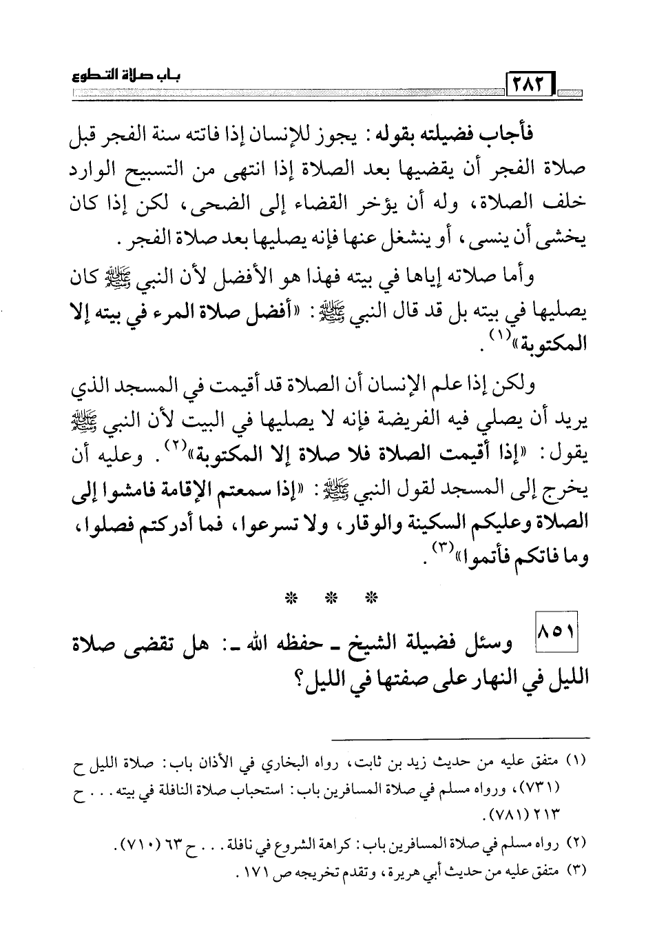 851 وسئل فضيلة الشيخ – حفظه الله -: هل تقضى صلاة الليل في النهار على صفتها في الليل؟