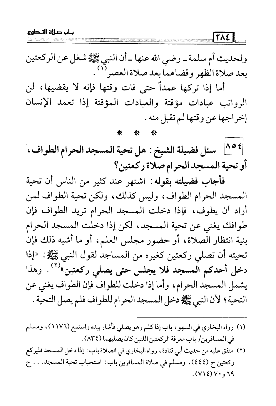 فأجاب فضيلته بقوله: اشتهر عند كثير من الناس أن تحية المسجد الحرام الطواف، وليس كذلك، ولكن تحية الطواف لمن أراد أن يطوف، فإذا دخلت المسجد الحرام تريد الطواف فإن طوافك يغني عن تحية المسجد، لكن إذا دخلت المسجد الحرام بنية انتظار الصلاة، أو حضور مجلس العلم، أو ما أشبه ذلك فإن تحيته أن تصلي ركعتين كغيره من المساجد لقول النبي صَلَّى اللَّهُ عَلَيْهِ وَسَلَّمَ: "إذا دخل أحدكم المسجد فلا يجلس حتى يصلي ركعتين" (¬2) . وهذا يشمل المسجد الحرام، وأما إذا دخلت للطواف فإن الطواف يغني عن التحية؛ لأن النبي صَلَّى اللَّهُ عَلَيْهِ وَسَلَّمَ دخل المسجد الحرام للطواف فلم يصل التحية.