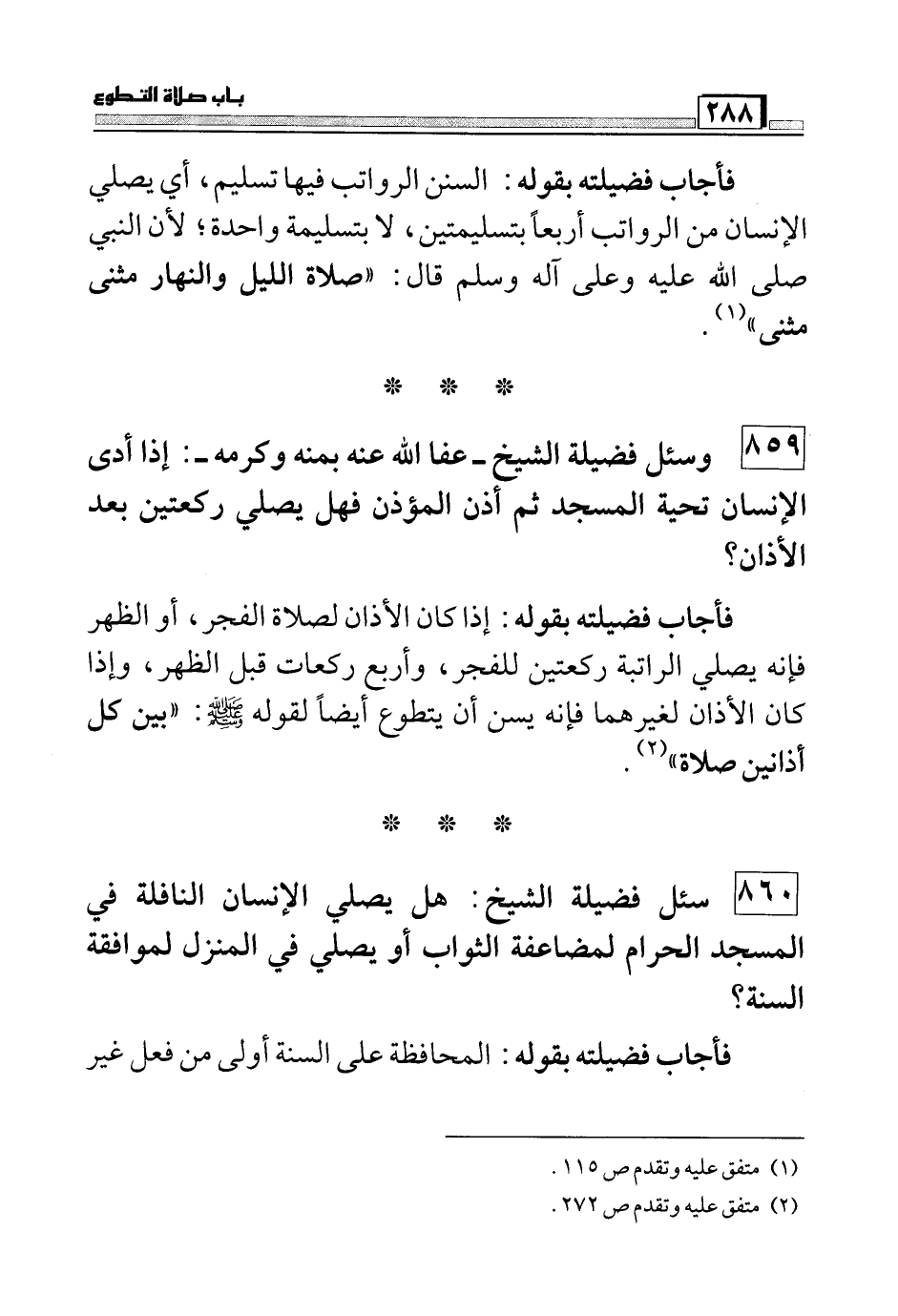 فأجاب فضيلته بقوله: السنن الرواتب فيها تسليم، أي يصلي الإنسان من الرواتب أربعاً بتسليمتين، لا بتسليمة واحدة؛ لأن النبي صَلَّى اللَّهُ عَلَيْهِ وَسَلَّمَ وعلى آله وسلم قال: "صلاة الليل والنهار مثنى مثنى" (¬1) .