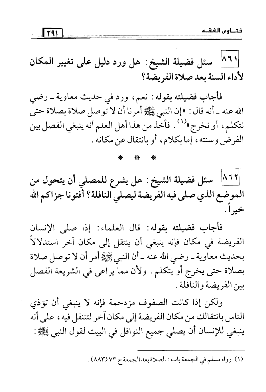 862 سئل فضيلة الشيخ: هل يشرع للمصلي أن يتحول من الموضع الذي صلى فيه الفريضة ليصلي النافلة؟ أفتونا جزاكم الله خيراً.