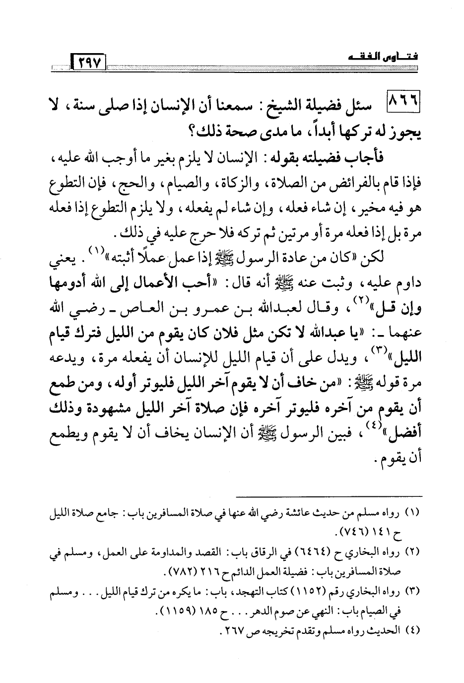 866 سئل فضيلة الشيخ: سمعت أن الإنسان إذا صلى سنة، لا يجوز له تركها أبداً، ما مدى صحة ذلك؟