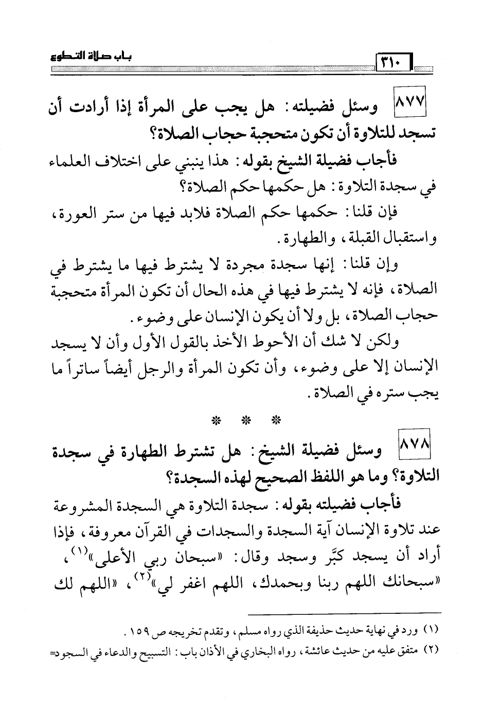 878 وسئل فضيلة الشيخ: هل تشترط الطهارة في سجدة التلاوة؟ وما وهو اللفظ الصحيح لهذه السجدة؟