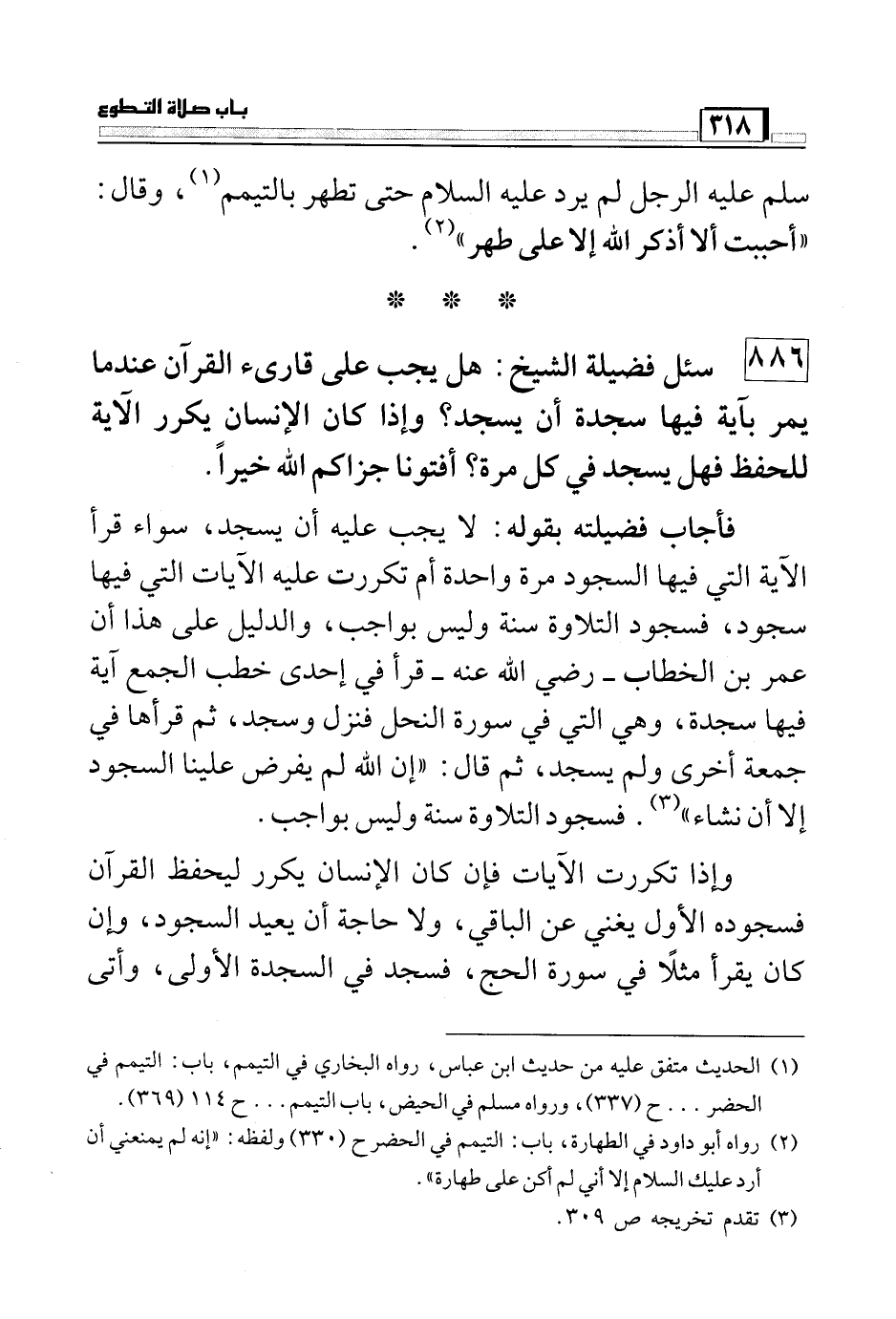 فأجاب فضيلته بقوله: لا يجب عليه أن يسجد، سواء قرأ الآية التي فيها السجود مرة واحدة أم تكررت عليه الآيات التي فيها سجود، فسجود التلاوة سنة وليس بواجب، والدليل على هذا أن عمر بن الخطاب – رضي الله عنه – قرأ في إحدى خطب الجمع آية فيها سجدة، وهي التي في سورة النحل فنزل وسجد، ثم قرأها في جمعة أخرى ولم يسجد، ثم قال: "إن الله لم يفرض علينا السجود إلا أن نشاء" (¬3) . فسجود التلاوة سنة وليس بواجب.