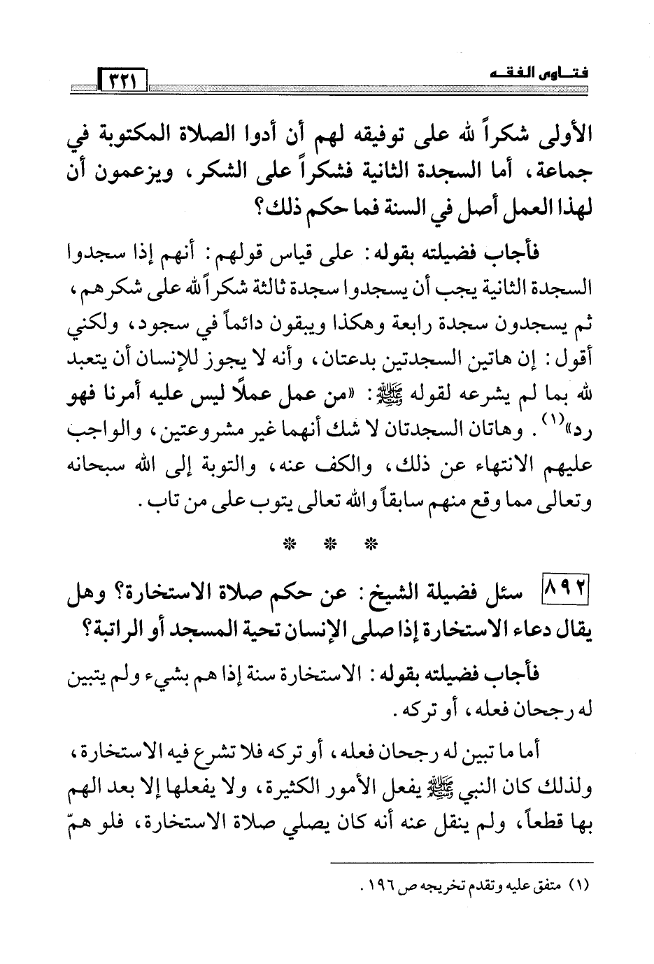 فأجاب فضيلته بقوله: على قياس قولهم: أنهم إذا سجدوا السجدة الثانية يجب أن يسجدوا سجدة ثالثة شكراً لله على شكرهم، ثم يسجدون سجدة رابعة وهكذا ويبقون دائماً في سجود، ولكني أقول: إن هاتين السجدتين بدعتان، وأنه لا يجوز للإنسان أن يتعبد لله بما لم يشرعه لقوله صَلَّى اللَّهُ عَلَيْهِ وَسَلَّمَ: "من عمل عملاً ليس عليه أمرنا فهو رد" (¬1) . وهاتان السجدتان لا شك أنهما غير مشروعتين، والواجب عليهم الانتهاء عن ذلك، والكف عنه، والتوبة إلى الله سبحانه وتعالى مما وقع سابقاً والله تعالى يتوب على من تاب.