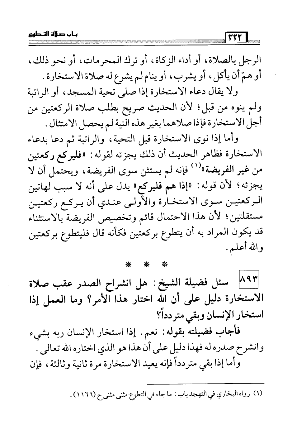 ولا يقال دعاء الاستخارة إذا صلى تحية المسجد، أو الراتبة ولم ينوه من قبل؛ لأن الحديث صريح بطلب صلاة الركعتين من أجل الاستخارة فإذا صلاهما بغير هذه النية لم يحصل الامتثال.