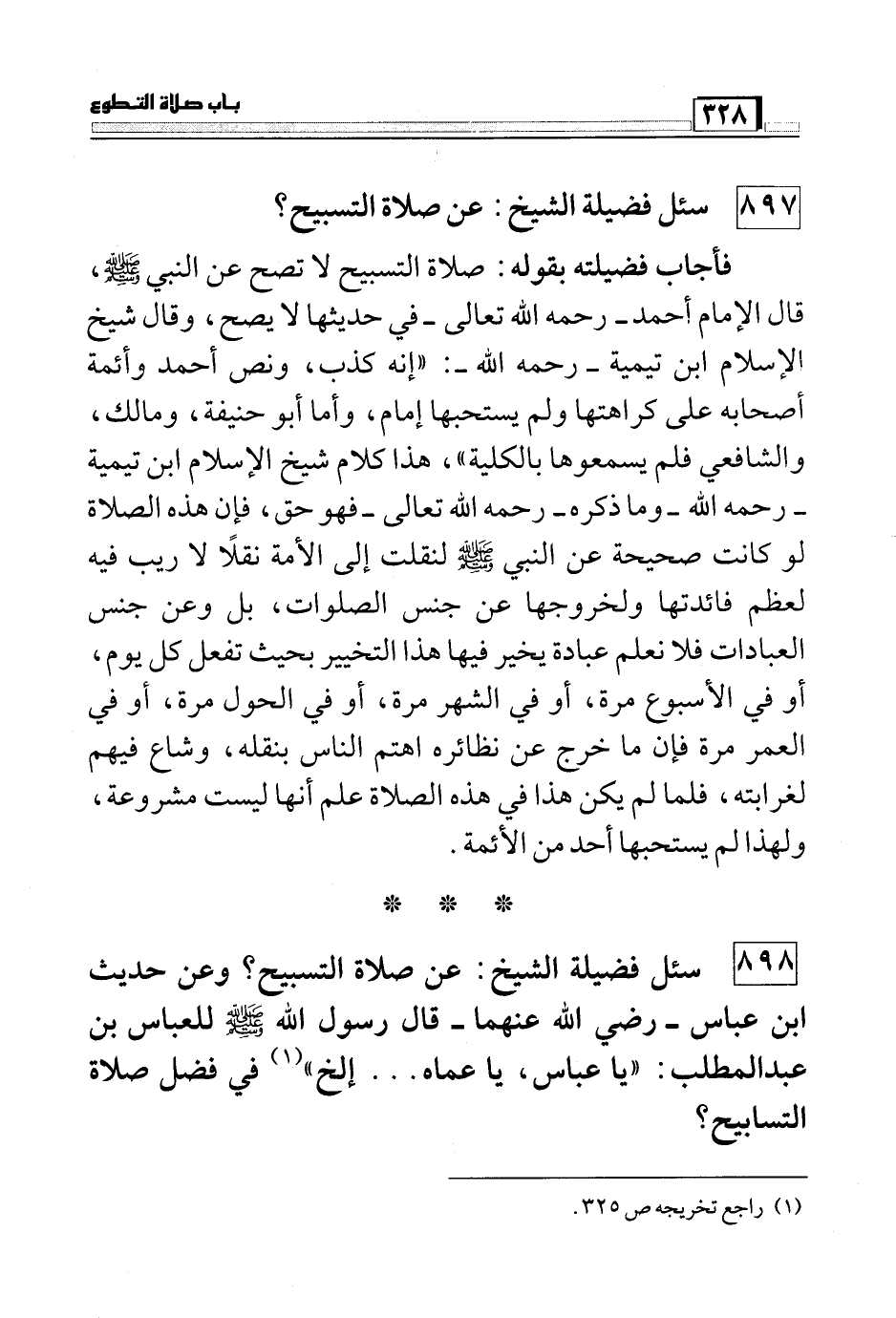 898 سئل فضيلة الشيخ: عن صلاة التسبيح؟ وعن حديث ابن عباس – رضي الله عنهما – قال رسول الله صَلَّى اللَّهُ عَلَيْهِ وَسَلَّمَ للعباس بن عبد المطلب: "يا عباس، يا عماه إلخ" (¬1) في فضل صلاة التسابيح؟