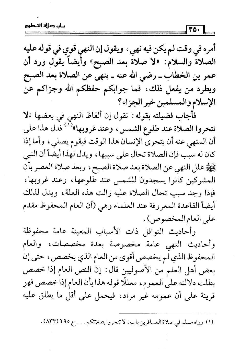 فأجاب فضيلته بقوله: نقول إن ألفاظ النهي في بعضها "لا تتحروا الصلاة عند طلوع الشمس، وعند غروبها" (¬1) فدل هذا على أن المنهي عنه أن يتحرى الإنسان هذا الوقت فيقوم يصلي، وأما إذا كان له سبب فإن الصلاة تحال على سببها، ويدل لهذا أيضاً أن النبي صَلَّى اللَّهُ عَلَيْهِ وَسَلَّمَ علل النهي عن الصلاة بعد صلاة الصبح، وبعد صلاة العصر بأن المشركين كانوا يسجدون للشمس عند طلوعها، وعند غروبها، فإذا وجد سبب تحال الصلاة عليه زالت هذه العلة، ويدل لذلك أيضاً القاعدة المعروفة عن العلماء وهي (أن العام المحفوظ مقدم على العام المخصوص) .