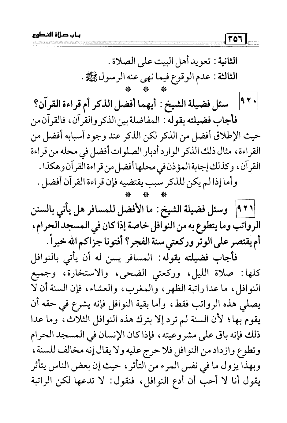 921 وسئل فضيلة الشيخ: ما الأفضل للمسافر هل يأتي بالسنن الرواتب وما يتطوع به من النوافل خاصة إذا كان في المسجد الحرام، أم يقتصر على الوتر وركعتي سنة الفجر؟ أفتونا جزاكم الله خيراً.