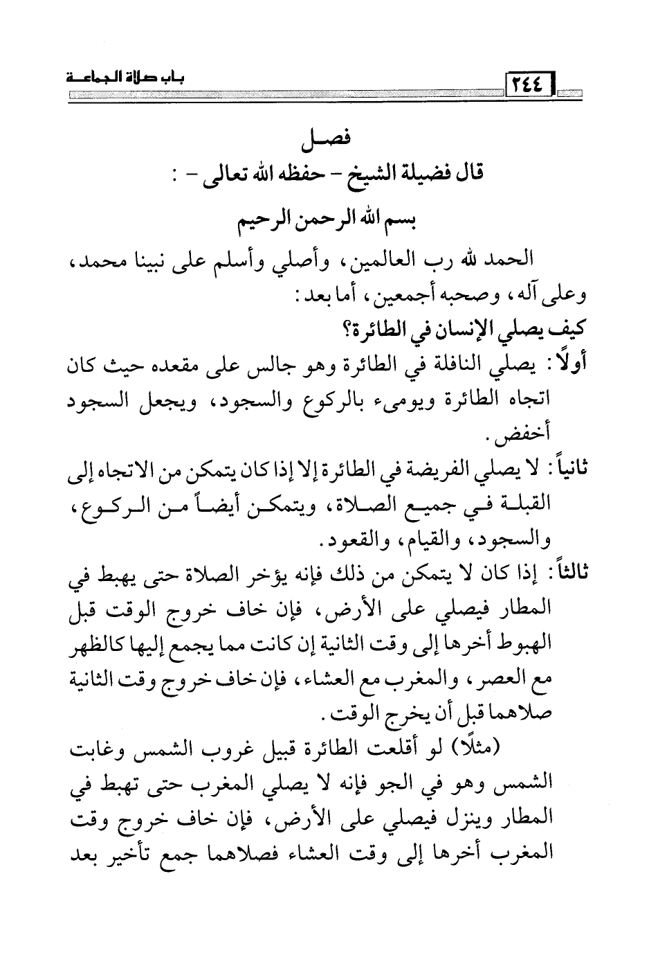ثانياً: لا يصلي الفريضة في الطائرة إلا إذا كان يتمكن من الاتجاه إلى القبلة في جميع الصلاة, ويتمكن أيضاً من الركوع, والسجود, والقيام, والقعود.