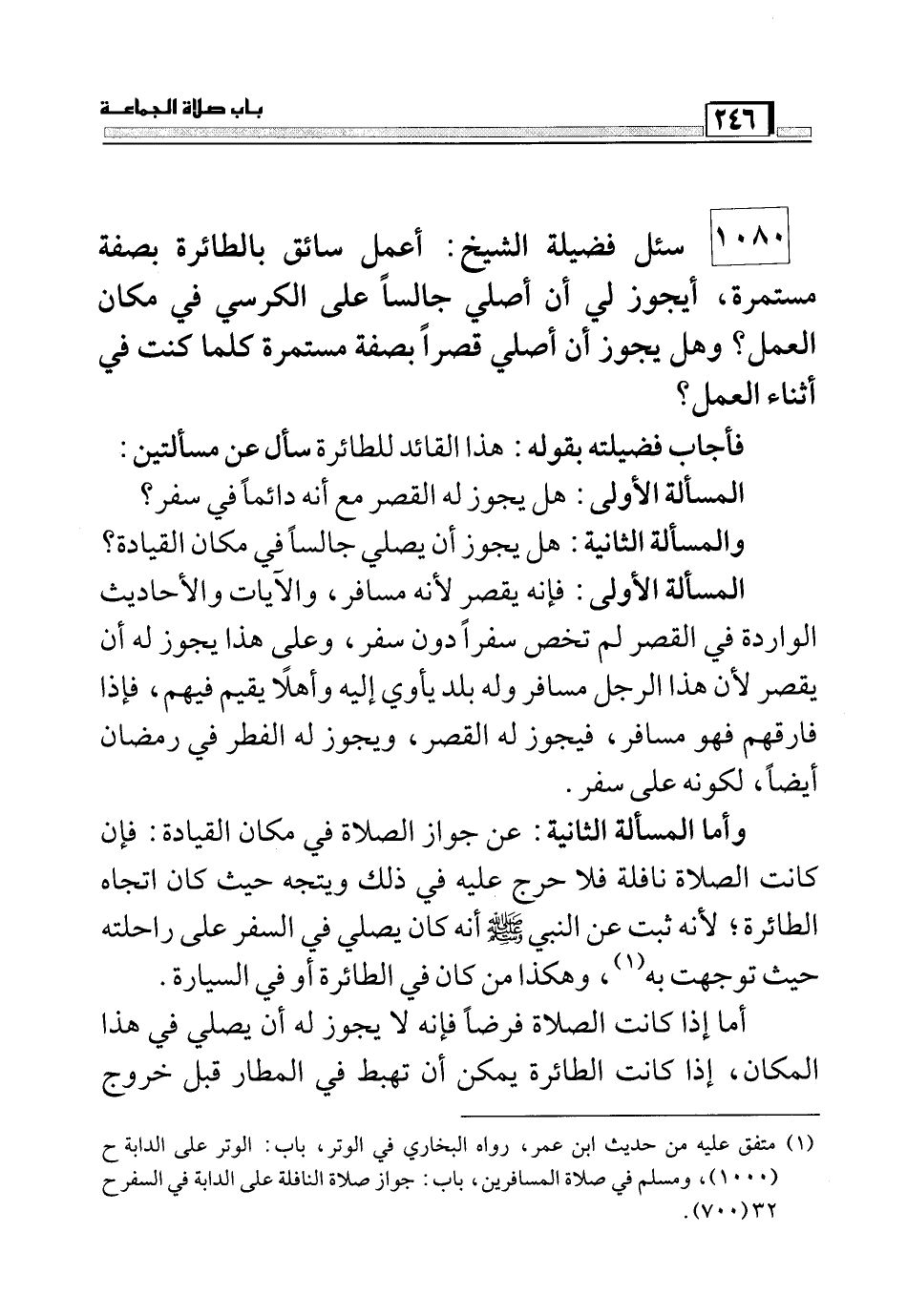 1080 وسئل فضيلة الشيخ:أعمل سائق بالطائرة بصفة مستمرة, أيجوز لي أن أصلي جالساً على الكرسي في مكان العمل؟ وهل يجوز أن أصلي قصراً بصفة مستمرة كلما كنت في أثناء العمل؟
