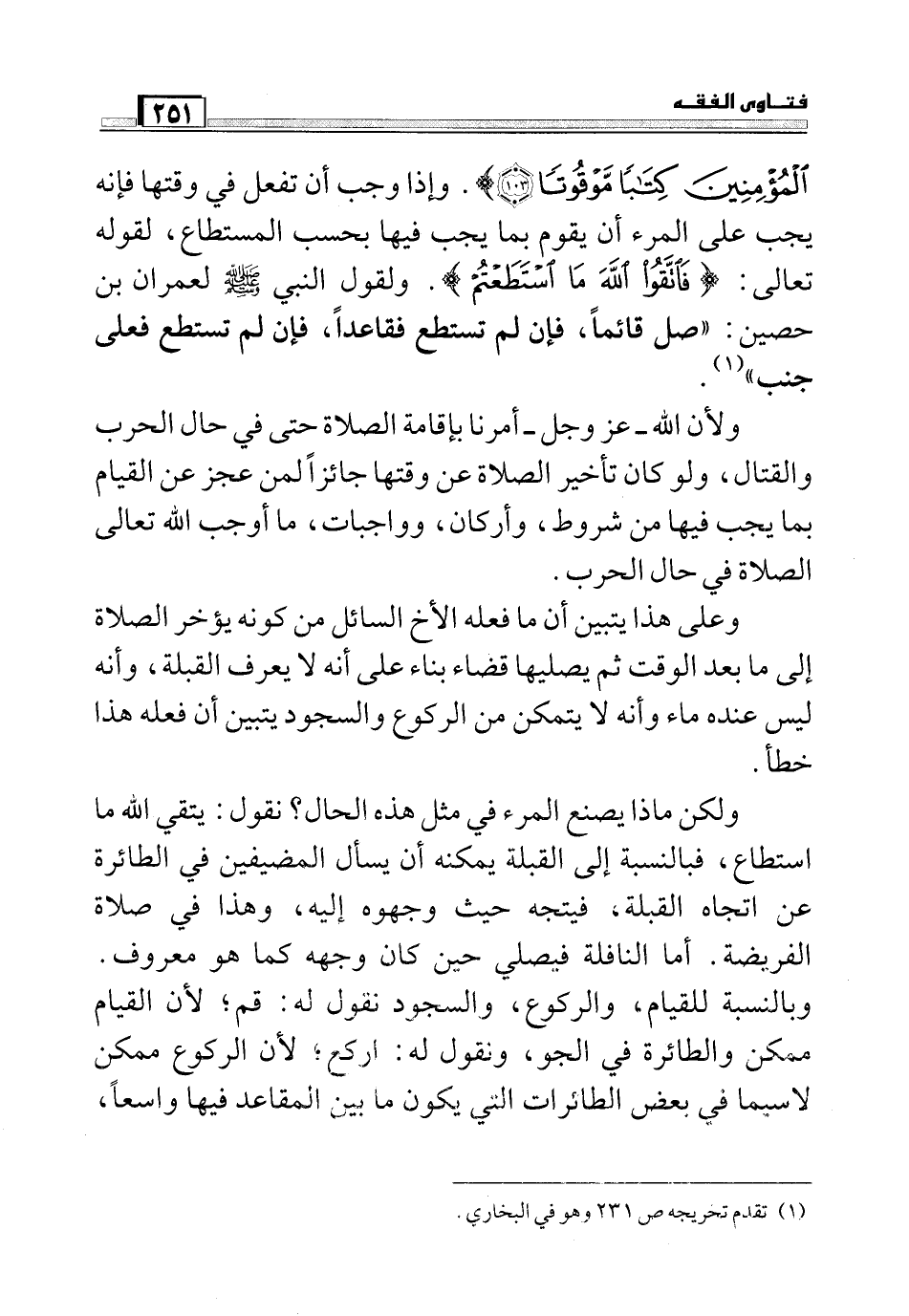 الْمُؤْمِنِينَ كِتَاباً مَوْقُوتاً) .وإذا وجب أن تفعل في وقتها فإنه يجب على المرء أن يقوم بما يجب فيها بحسب المستطاع, لقوله تعالى: (فَاتَّقُوا اللَّهَ مَا اسْتَطَعْتُم) .ولقول النبي صلي الله عليه وسلم (صل قائماً, فإن لم تستطع فقاعداً, فإن لم تستطع فعلى جنب) (1) .