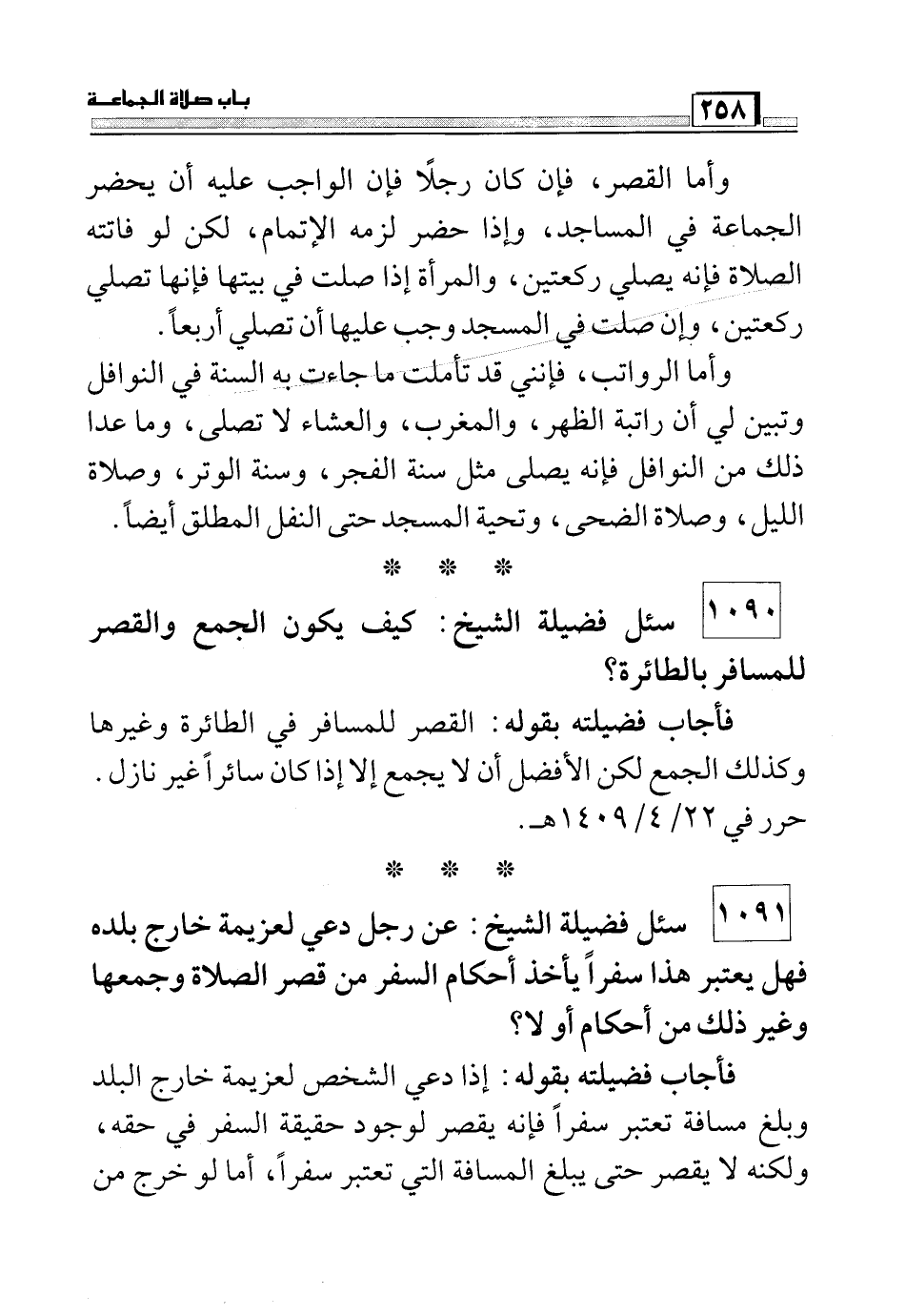 فأجاب فضيلته بقوله: القصر للمسافر في الطائرة وغيرهما وكذلك الجمع لكن الأفضل أن لا يجمع إلا إذا كان سائراً غير نازل حرر في 22/4/1409هـ.