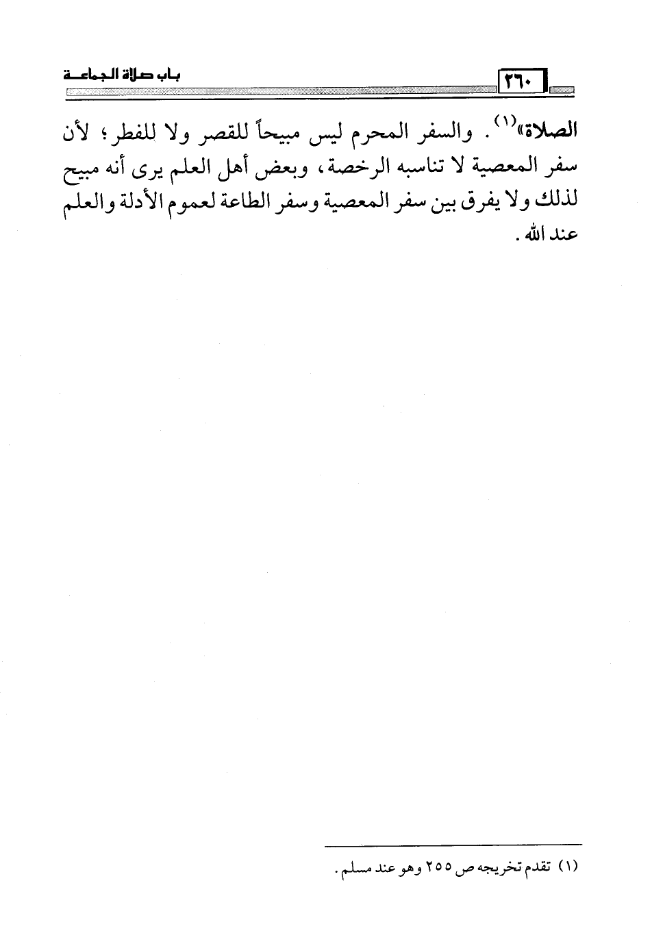 الصلاة) (1) . والسفر المحرم ليس مبيحاً للقصر ولا للفطر؛ لأن سفر المعصية لا تناسبه الرخصة, وبعض أهل العلم يرى أنه مبيح لذلك ولا يفرق بين سفر المعصية وسفر الطاعة لعموم الأدلة والعلم عند الله.