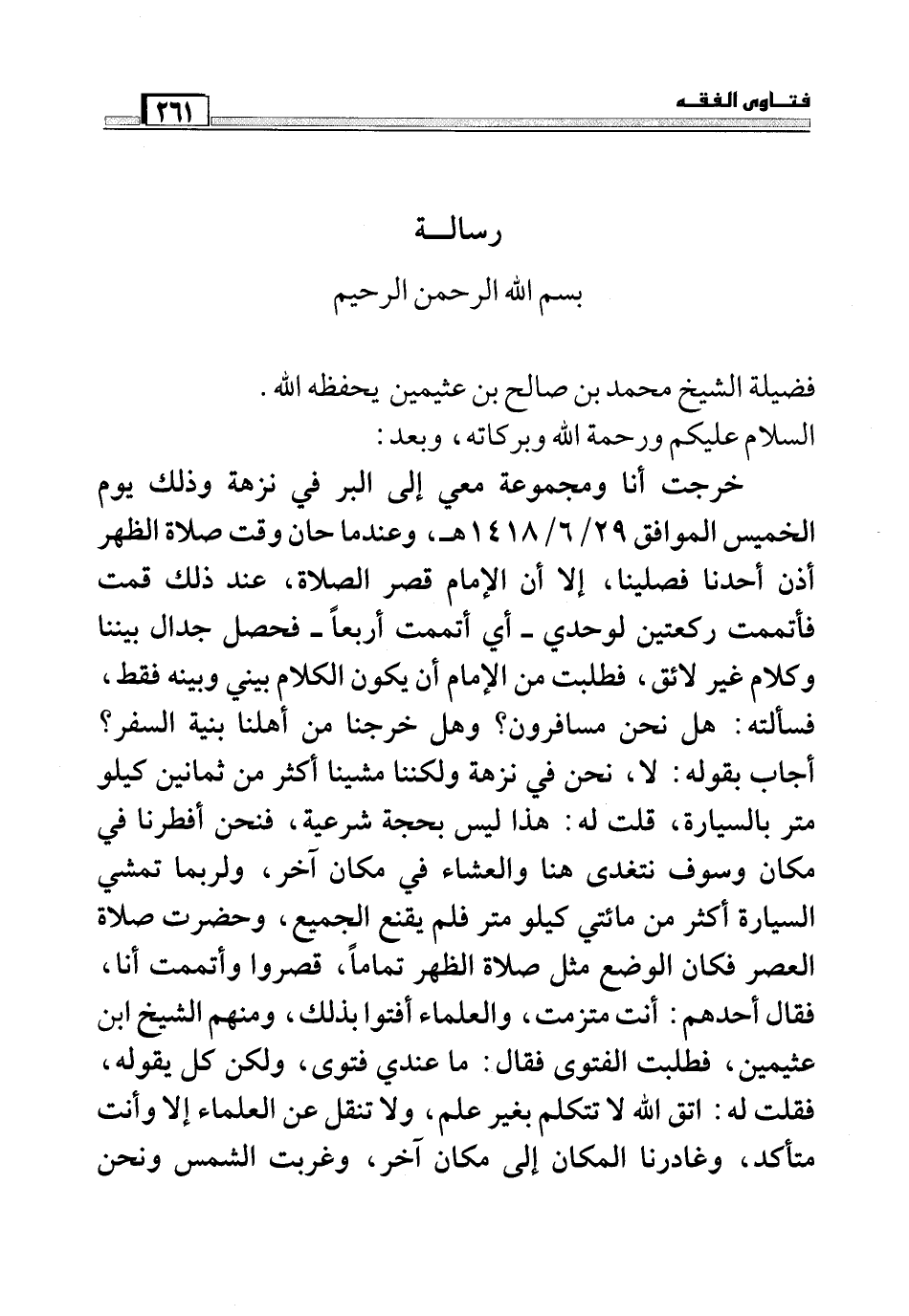 خرجت أنا ومجموعة معي إلى البر في نزهة وذلك يوم الخميس الموافق 29/6/1418 هـ ,وعندما حان وقت صلاة الظهر أذن أحدنا فصلينا, إلا أن الإمام قصر الصلاة, وعند ذلك قمت فأتممت ركعتين لوحدي - أي تممت أربعاً - فحصل جدال بيننا وكلام غير لائق ,فطلبت من الإمام أن يكون الكلام بيني وبينه فقط ,فسألته: كهل نحن مسافرون؟ وهل خرجنا من أهلنا بنية السفر؟ أجاب بقوله:لا, نحن في نزهة ولكننا مشينا أكثر من ثمانين كيلو متر بالسيارة, قلت له: هذا ليس بحجة شرعية, فنحن أفطرنا في مكان وسوف نتغدى هنا والعشاء في مكان آخر, ولربما تمشي السيارة أكثر من مائتي كيلو متر فلم يقنع الجميع, وحضرت صلاة العصر فكان الوضع مثل صلاة الظهر تماماً, قصراً وأتممت أنا, فقال أحدهم: أنت متزمت, والعلماء أفتوا بذلك, ومنهم الشيخ ابن عثيمين, فطلبت الفتوى فقال: ما عندي فتوى, ولكن كل يقوله, فقلت له: اتق الله لا تتكلم بغير علم, ولا تنقل عن العلماء إلا وأنت متأكد, وغادرنا المكان إلى مكان آخر, وغربت الشمس ونحن