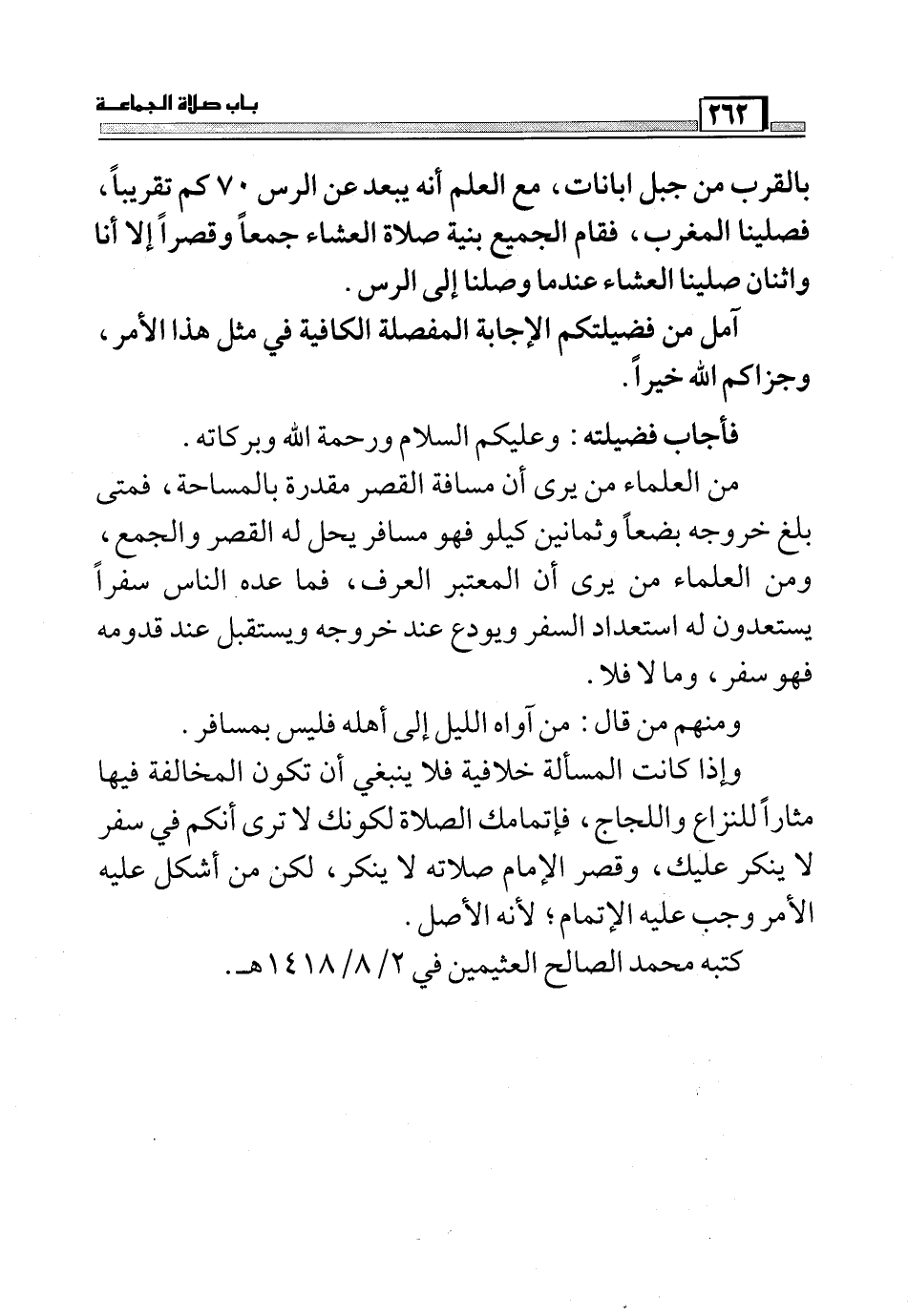 من العلماء من يرى أن مسافة القصر بالمساحة, فمتى بلغ خروجه بضعاً وثمانين كيلو فهو مسافر يحل له القصر والجمع, ومن العلماء من يرى أن المعتبر العرف, فما عده الناس سفراً يستعدون له استعداد السفر ويودع عند خروجه ويستقبل عند قدومه فهو سفر, وما لا فلا.