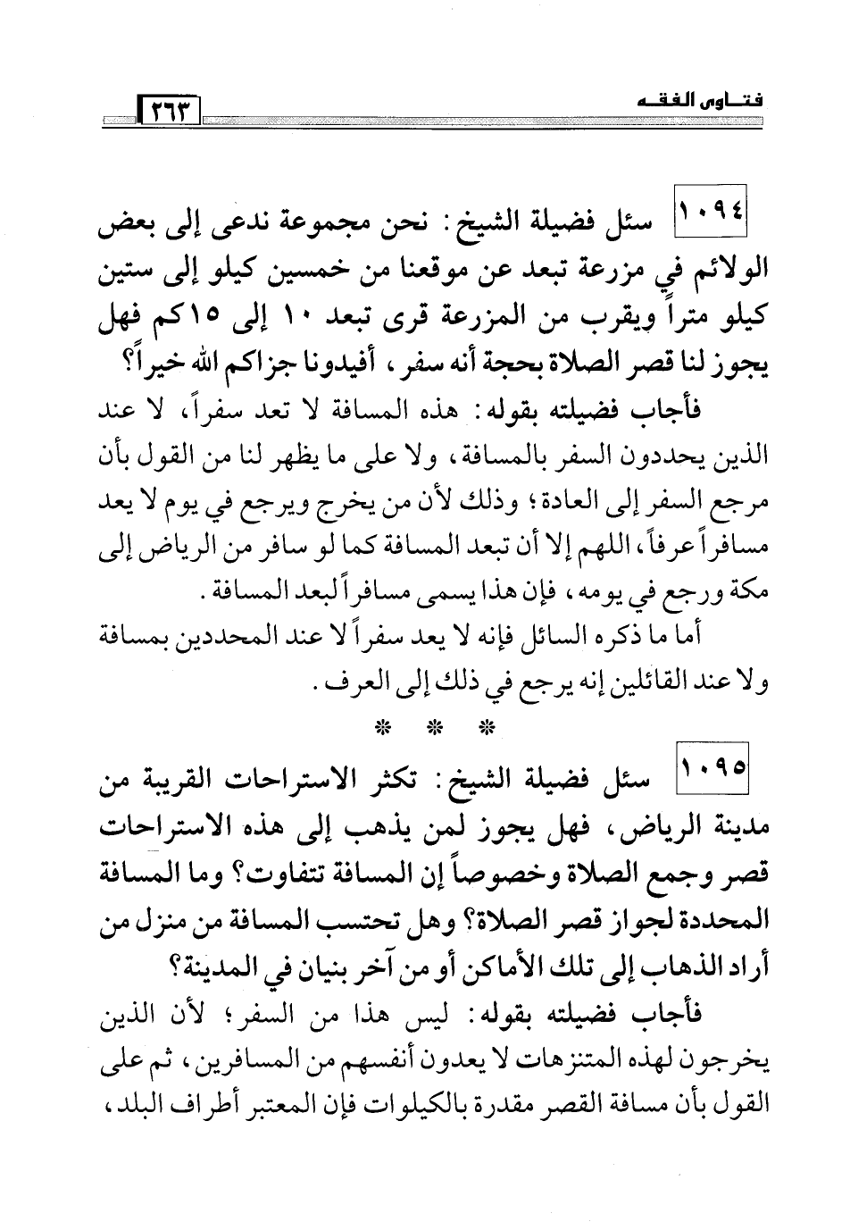 فأجاب فضيلته بقوله: ليس من السفر؛ لأن الذين يخرجون لهذه المنتزهات لا يعدون أنفسهم من المسافرين, ثم على القول بأن مسافة القصر مقدرة بالكيلوات فإن المعتبر أطراف البلد,