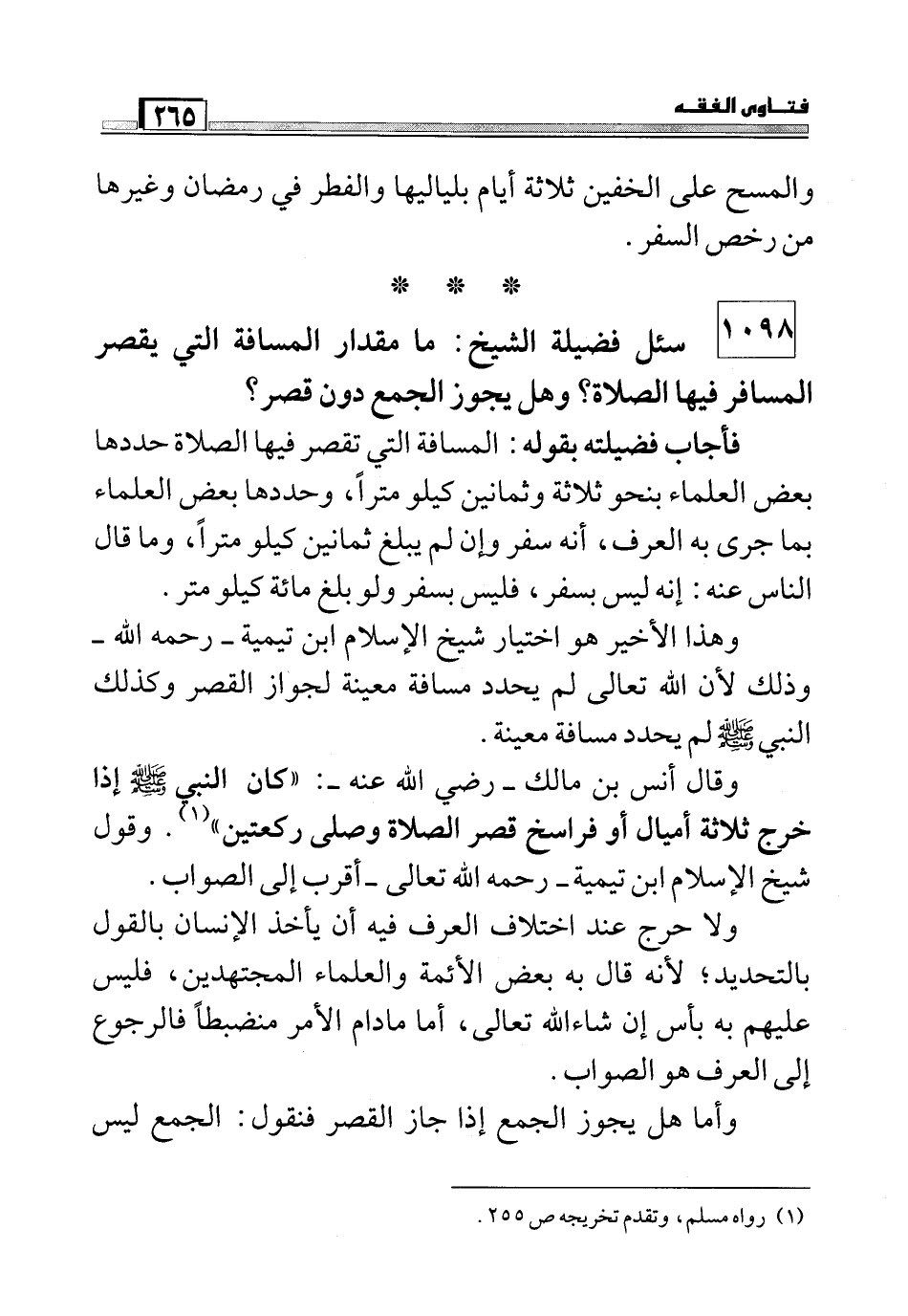 1098 سئل فضيلة الشيخ: ما مقدار المسافة التي يقصر المسافر فيها الصلاة؟ وهل يجوز الجمع دون قصر؟