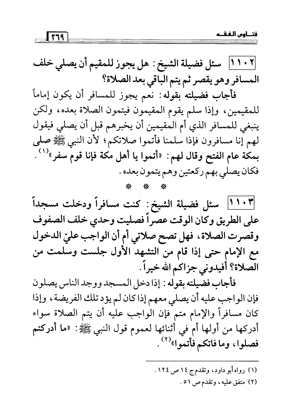 1102 سئل فضيلة الشيخ: هل يجوز للمقيم أن يصلي خلف المسافر وهو يقصر ثم يتم بعد الصلاة؟