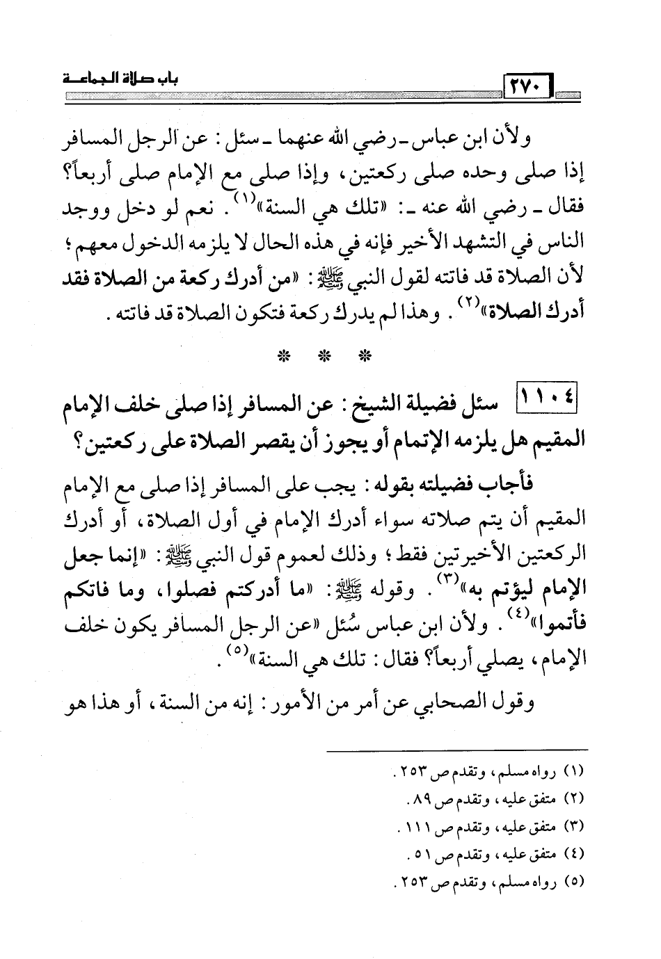 1104 سئل فضيلة الشيخ: عن المسافر إذا صلى خلف الإمام المقيم هل يلزمه الإتمام أو يجوز أن يقصروا الصلاة على ركعتين؟