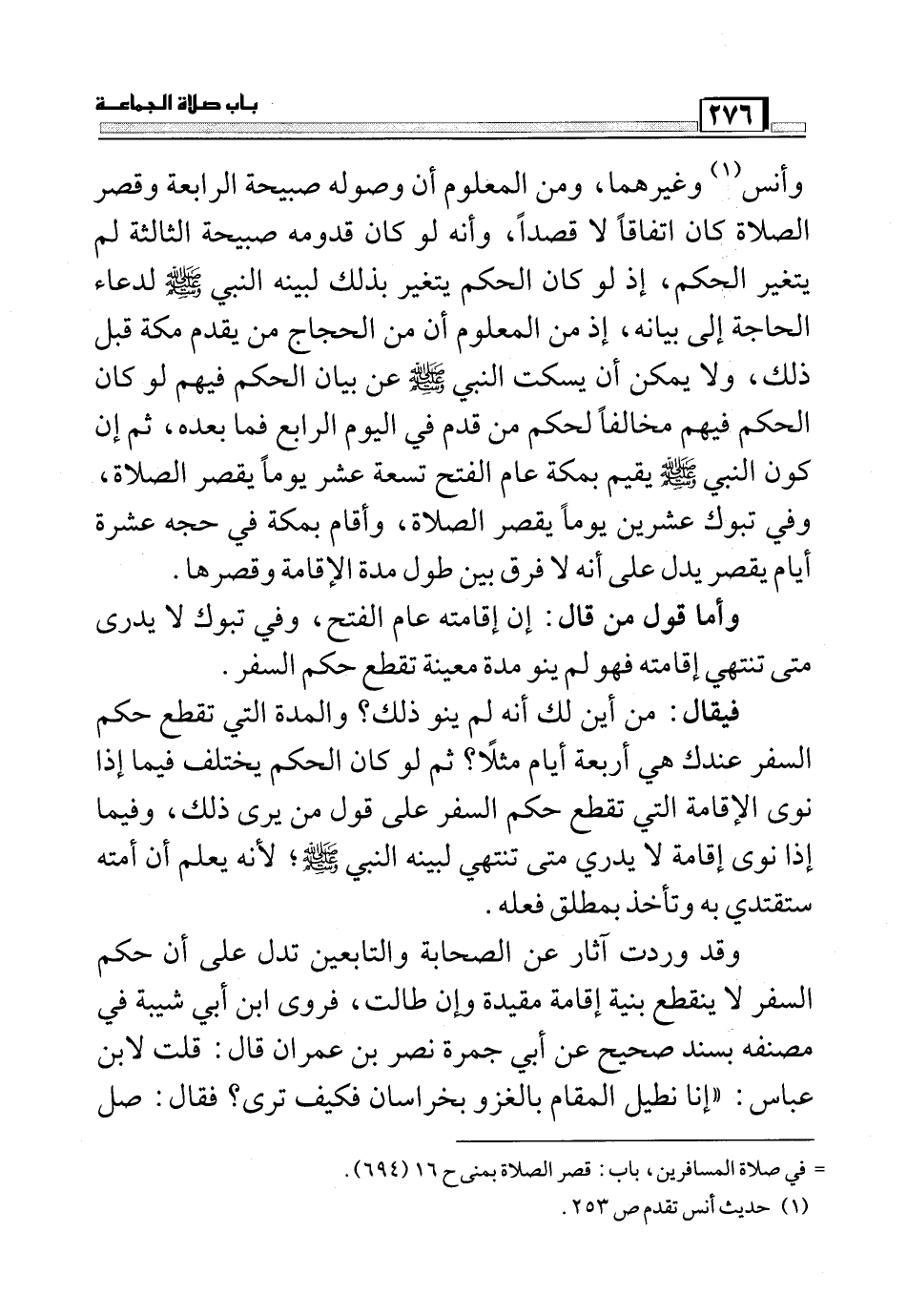 فيقال: من أين لك أن لم ينو ذلك؟ والمدة التي تقطع حكم السفر عندك هي أربعة أيام مثلاً؟ ثم لو كان الحكم يختلف فيما إذا نوى الإقامة التي تقطع حكم السفر على قول من يرى ذلك, وفيما إذا نوى إقامة لا يدري متى تنتهي لبينه النبي صلي الله عليه وسلم, لأنه يعلم أن أمته ستغتدي به وتأخذ بمطلق فعله. وقد وردت آثار عن الصحابة والتابعين تدل على أن حكم السفر لا ينقطع بنية إقامة مقيدة وإن طالت, فروى ابن أبي شيبة في مصنفه بسند صحيح عن أبي حمزة نصر بن عمران قال: قلت لابن عباس (إنا نطيل المقام بالغزو بخرا سان فكيف ترى؟ فقال: صل