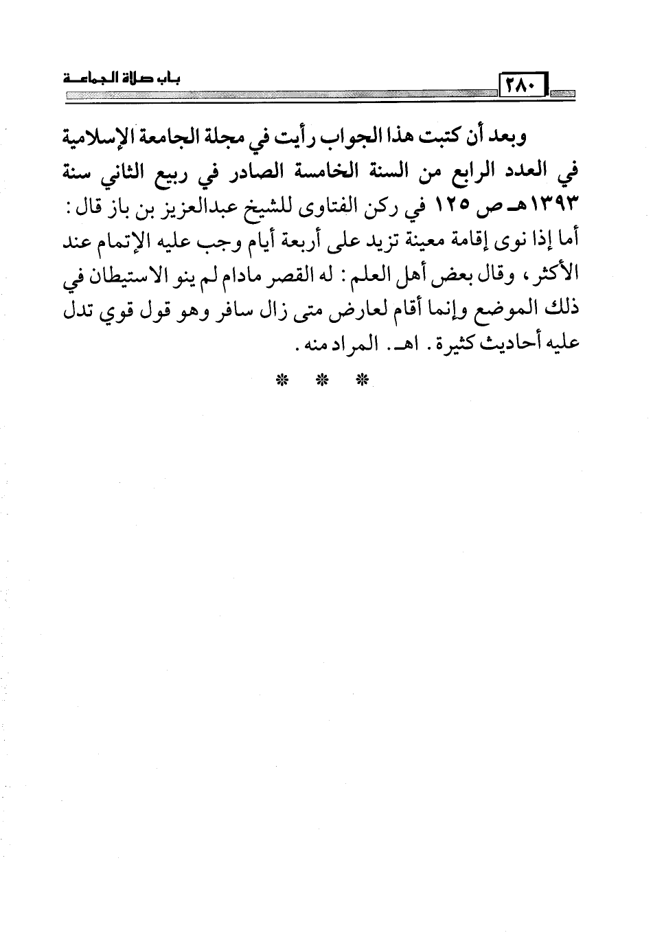 وبعد ان كتبت هذا الجواب رأيت في مجلة الجامعة الإسلامية في العدد الرابع من السنة الخامسة الصادر في ربيع الثاني سنة 1393 هـ ص 125 في ركن الفتاوى للشيخ عبد العزيز بن باز قال: أما إذا نوى إقامة معينه تزيد على أربعة أيام وجب عليه الأتمام عند الأكثر، وقال بعض أهل العلم: له القصر مادام لم ينو الاستيطان في ذلك الموضع وإنما أقام لعارض متى زال سافر وهو قوي تدل عليه أحاديث كثيرة. اهـ. المراد منه.