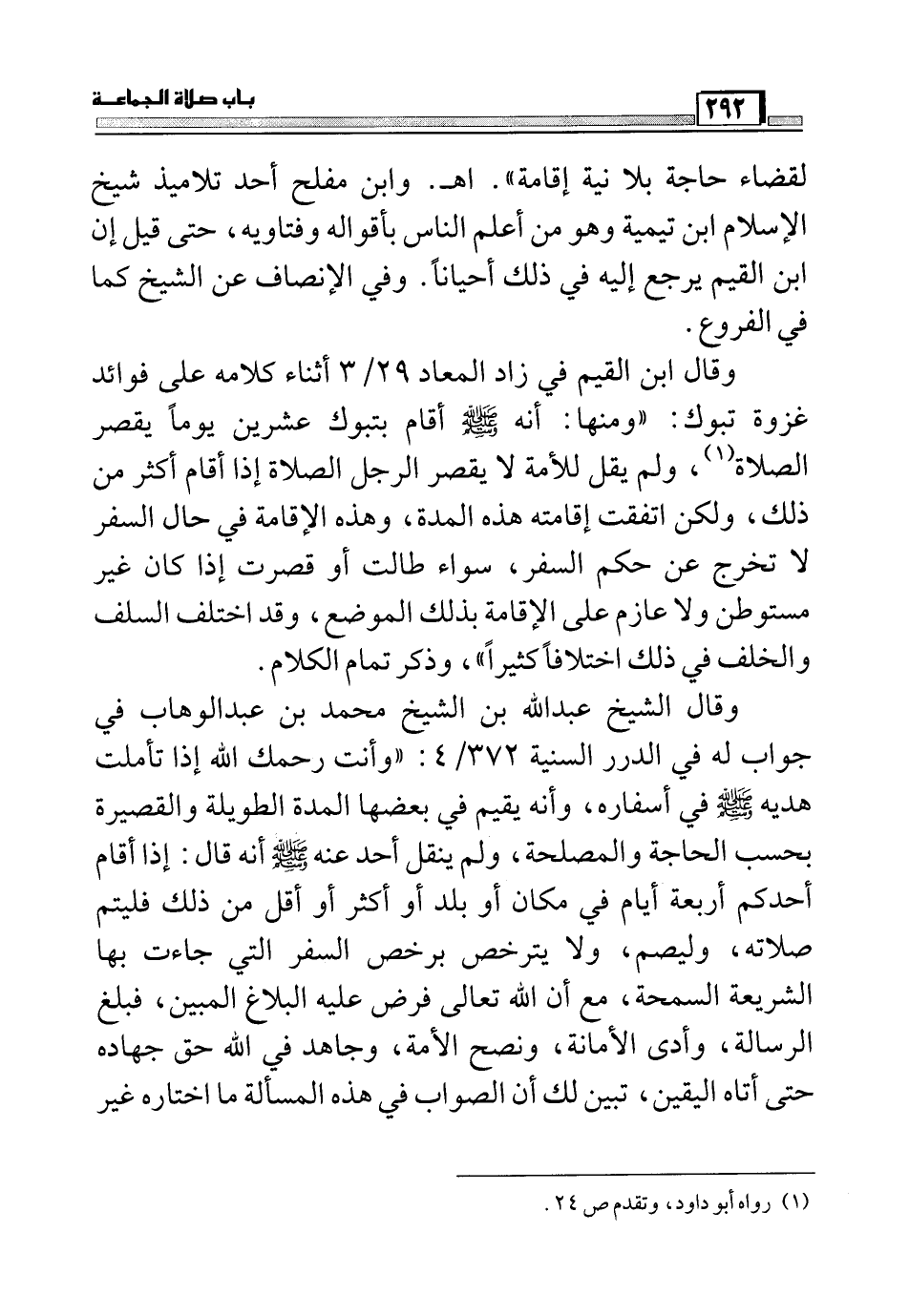 وقال الشيخ عبد الله بن الشيخ محمد بن عبد الوهاب في جواب له في الدرر السنية 372/ 4: " وأنت رحمك الله إذا تأملت هديه صلى الله عليه وسلم في أسفاره، وأنه يقيم في بعضها المدة الطويلة والقصيرة بحسب الحاجة والمصلحة، ولم ينقل أحدا عنه صلى الله عليه وسلم أنه قال: إذا إقام أحدكم أربعة أيام في مكان أو بلد أو أكثر أو أقل من ذلك فليتم صلاته، وليصم، ولا يترخص برخص السفر التي جاءت بها الشريعة السمحة، مع أن الله تعالى فرض عليه البلاغ المبين، فبلغ الرسالة وأدى الأمانه، ونصح الأمة، وجاهد في الله حق جهاده حتى أتاه اليقين، تبين لك أن الصواب في هذه المسألة ما اختاره غير