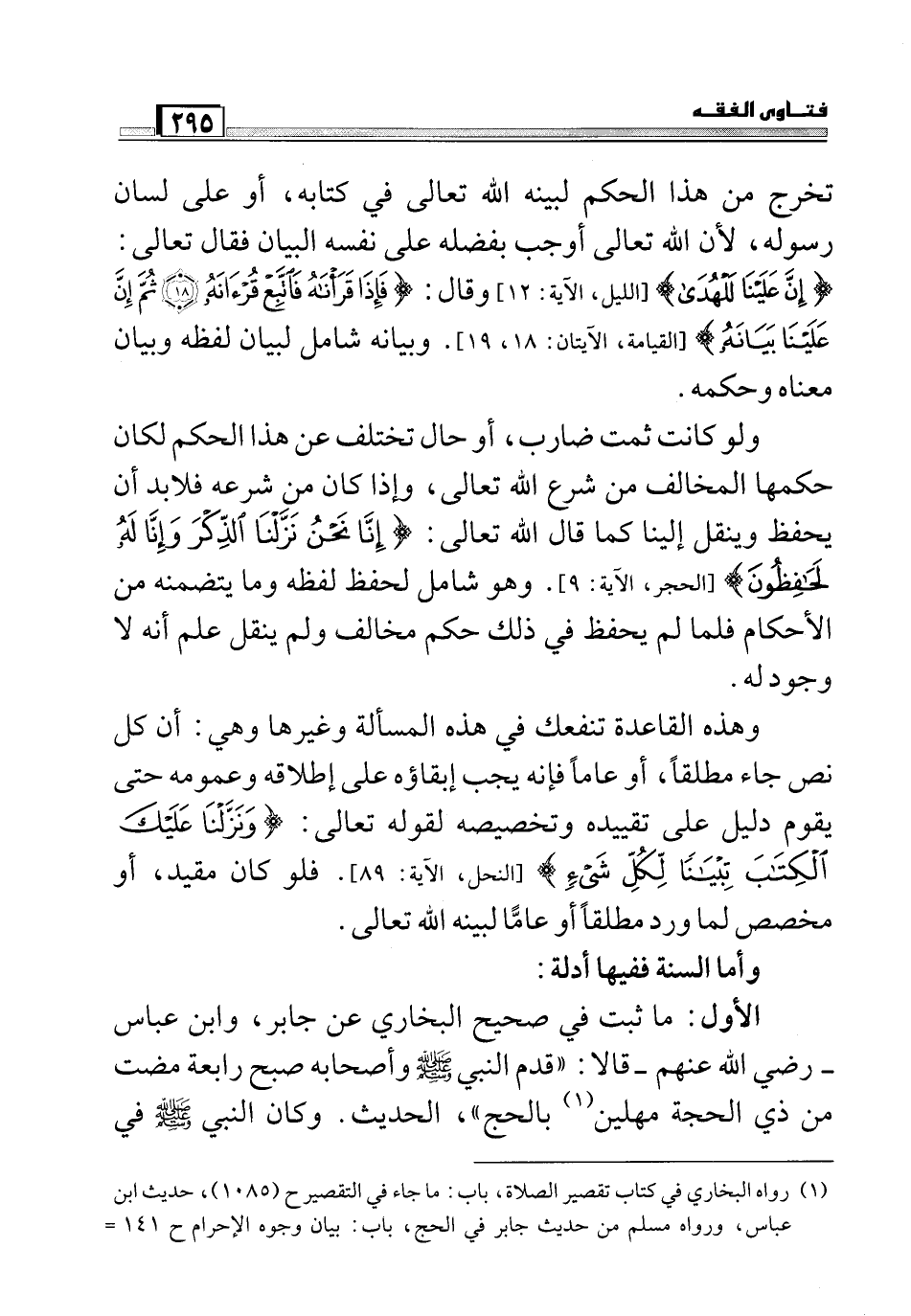 وهذه القاعدة تنفعك في هذه المسألة وغيرها وهي: أن كل نص جاء مطلقاً، أو عاماً فإنه يجب إبقاءه على إطلاقه وعمومه حتى يقوم دليل على تقييده وتخصيصه لقوله تعالى (وَنَزَّلْنَا عَلَيْكَ الْكِتَابَ تِبْيَانًا لِكُلِّ شَيْءٍ) [النحل، الآية: 89] فلو كان مقيد أو مخصص لما ورد مطلقاً أو عاماً لبينه الله تعالى.