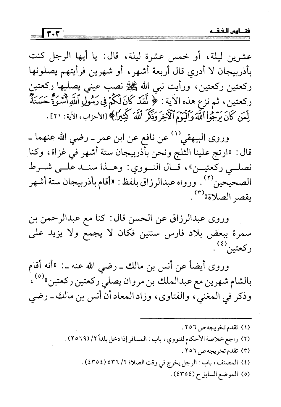 عشرين ليلة، أو خمس عشرة ليلة، قال: يا أيها الرجل كنت بأذربيجان لا أدري قال أربعة أشهر أو شهرين فرأيتهم يصلونها ركعتين ركعتين، ورأيت نبي الله صلي الله عليه وسلم نصب عيني يصليها ركعتين ركعتين, ثم نزع هذه الآية: (لَقَدْ كَانَ لَكُمْ فِي رَسُولِ اللَّهِ أُسْوَةٌ حَسَنَةٌ لِمَنْ كَانَ يَرْجُو اللَّهَ وَالْيَوْمَ الْآخِرَ وَذَكَرَ اللَّهَ كَثِيراً) (الأحزاب:21)