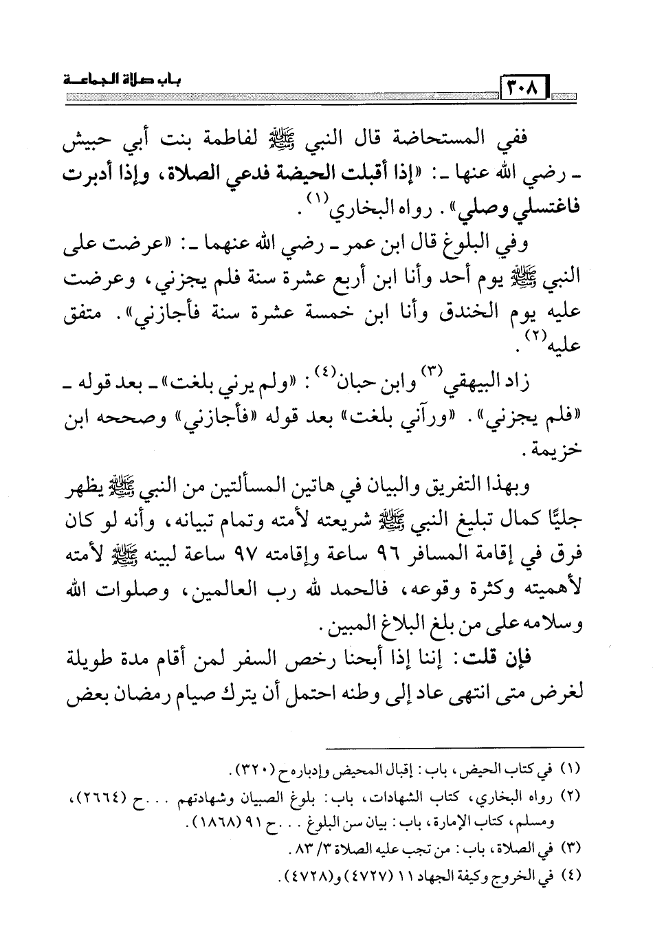 وبهذا التفريق والبيان في هاتين المسألتين من النبي صلي الله عليه وسلم يظهر جلياً كمال تبليغ النبي صلي الله عليه وسلم شريعته لأمته وتمام تبيانه, وأنه لو كان فرق في إقامة المسافر 96 ساعة وإقامته 97 ساعة لبينه صلي الله عليه وسلم لأمته لأهميته وكثرة وقوعه, فالحمد لله رب العلمين, صلوات الله وسلامه على من بلغ البلاغ المبين.