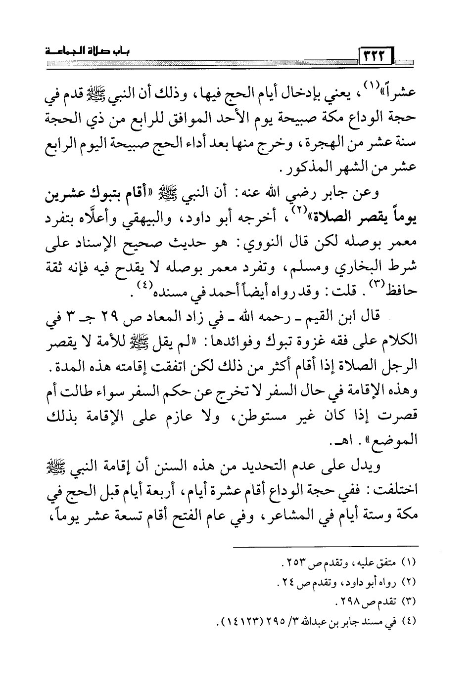 وعن جابر رضي الله عنه: أن النبي صلي الله عليه وسلم ((أقام بتبوك عشرين يوماً يقصر الصلاة) (3) ,أخرجه أبو داود, والبيهقي وأعلاه بتفرد معمر بوصله لكن قال النووي: وهو حديث صحيح الإسناد على شرط البخاري ومسلم, وتفرد معمر بوصله لا يقدح فيه فإنه ثقة حافظ (4) .قلت: وقد رواه أيضاً أحمد في مسنده (5) .
