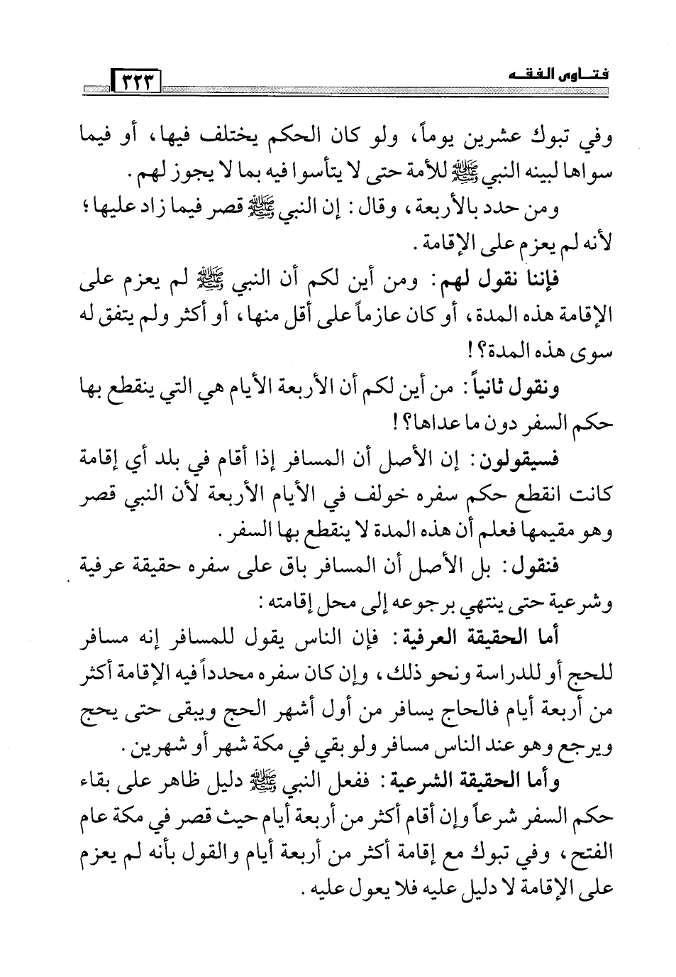 وأما الحقيقة الشرعية: ففعل النبي صلي الله عليه وسلم دليل ظاهر على بقاء حكم السفر شرعاً وإن أقام أكثر من أربعة أيام حيث قصر في مكة عام الفتح, وفي تبوك مع إقامة أكثر من أربعة أيام والقول بأنه لم يعزم على الإقامة لا دليل عليه فلا يعول عليه.