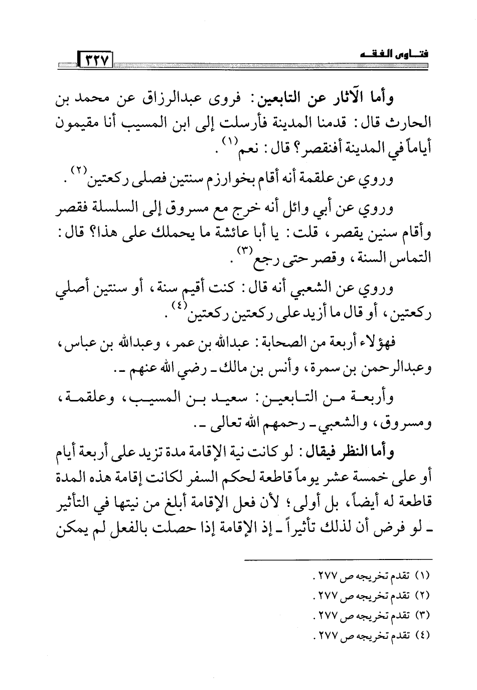 وأما الآثار عن التابعين: فروى عبد الرزاق عن محمد بن الحارث قال: قدمنا المدينة فأرسلت إلى ابن المسيب أنا مقيمون أياما في الدينة أفنقصر؟ قال: نعم (1) .