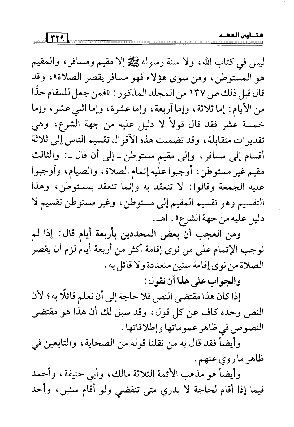 ليس في كتاب الله، ولا سنة رسوله صلي الله عليه وسلم إلا مقيم ومسافر، والمقيم هو المستوطن، ومن سوى هؤلاء فهو مسافر يقصر الصلاة) ، وقد قال قبل ذلك ص 137 من المجلد المذكور: ((فمن جعل للمقام حدًّا من الأيام: إما ثلاثة، وإما أربعة، وإما عشرة، وإما اثني عشر، وهي تقديرات متقابلة، وقد تضمنت هذه الأقوال تقسيم الناس إلى ثلاثة أقسام إلى مسافر، وإلى مقيم مستوطن -إلى أن قال- والثالث مقيم غير مستوطن، وأوجبوا عليه إتمام الصلاة، والصيام، وأوجبوا عليه الجمعة وقالوا: (لا تنعقد به وإنما تنعقد بمستوطن، وغير مستوطن، وغير مستوطن تقسيم لا دليل عليه من جهة الشرع) .أهـ.