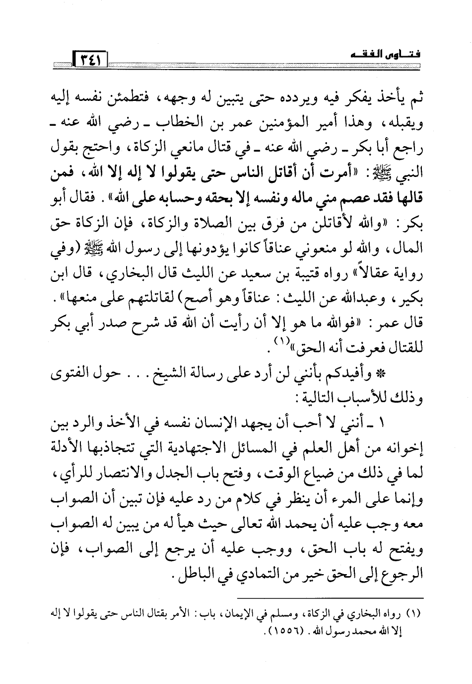 ثم يأخذ يفكر فيه ويردده حتى يتبين له وجهه, فتطمئن نفسه إليه ويقلبه, وهذا أمير المؤمنين عمر بن الخطاب - رضي الله عنه - راجع أبا بكر - رضي الله عنه - في قتال مانعي الزكاة, احتج بقول النبي صلي الله عليه وسلم (أمرت أن أقاتل الناس حتى يقولوا لا إله إلا الله, فمن قالها فقد عصم مني ماله ونفسه إلا بحقه وحسابه على الله) . فقال أبو بكر (والله لأقتلن من فرق بين الصلاة والزكاة, فإن الزكاة حق المال, والله لو منعوني عناقاً كانوا يؤدونها إلى رسول الله (وفي رواية عقالاً) رواه قتيبة بن سعيد عن الليث قال البخاري, قال ابن بكير, وعبد الله عن الليث: عناقاً وهو أصح لقاتلتهم على منعها) . قال عمر (فوالله ما هو إلا أن رأيت أن الله قد شرح صدر أبي بكر للقتال فعرفت أنه للحق) (1) وأفيدكم بأنني لن أرد على رسالة الشيخ. . . حول الفتوى وذلك للأسباب التالية: