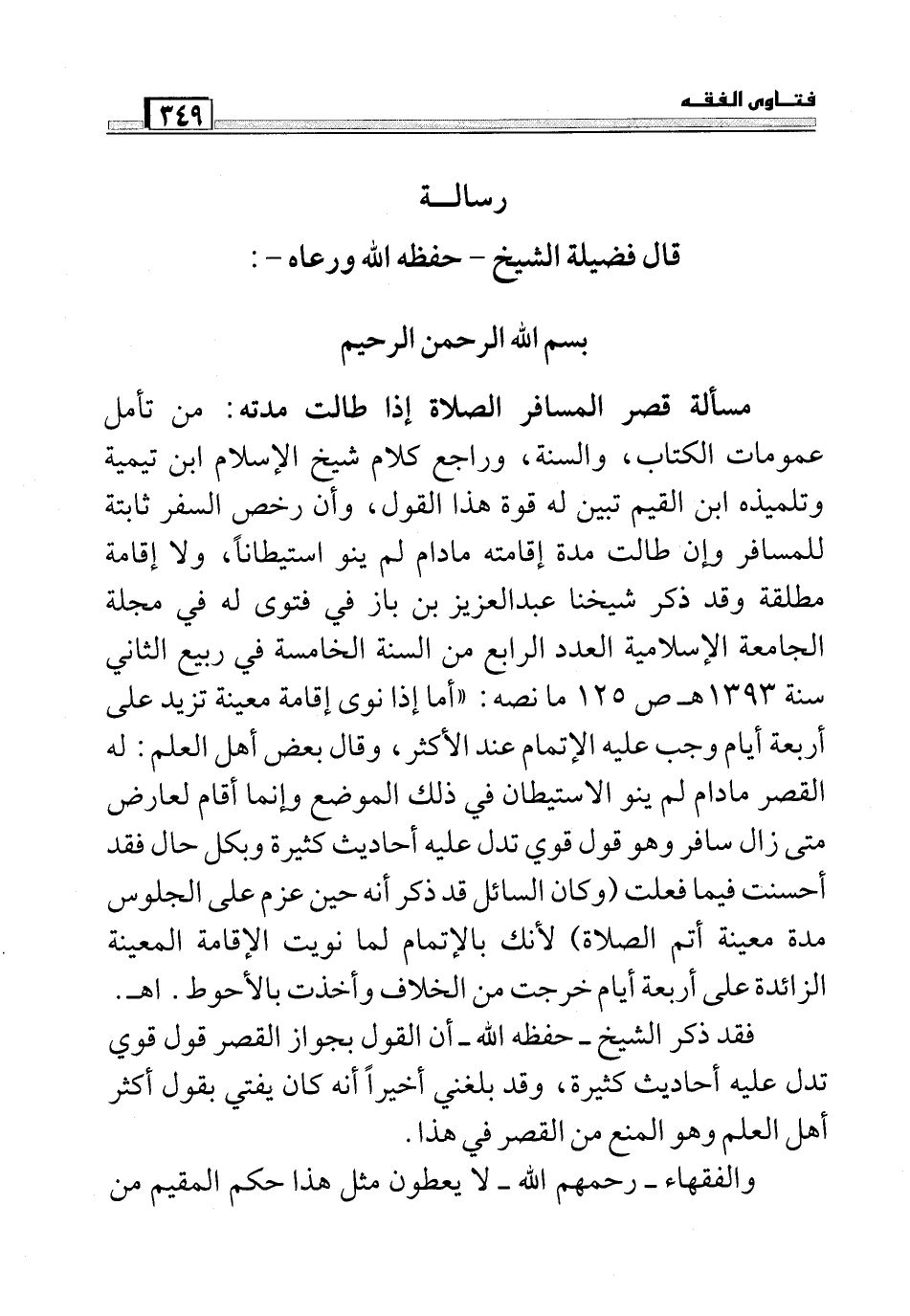 مسألة قصر المسافر الصلاة إذا طالت مدته: من تأمل عمومات الكتاب, والسنة, وراجع لام شيخ الإسلام ابن تيميه وتلميذه ابن القيم تبين له قوة هذا القول, وأن رخص السفر ثابتة للمسافر وإن طالت مدة إقامته ما دام لم ينو استيطاناً, ولا إقامة مطلقة وقد ذكر شيخنا عبد العزيز بن باز من السنة الخامسة في ربيع الثاني سنة 1393هـ ص 125 ما نصه (أما إذا نوى إقامة معينة تزيد على أربعة أيام وجب عليه الإتمام عند الأكثر, وقال أهل العلم: له القصر ما دام لم ينو استيطان في ذلك الموضع وإنما أقام لعارض متى زال سافر وهو قول قوي تدل عليه أحاديث كثيرة وبكل حال فقد أحسنت فيما فعلت (وكان السائل قد أكد أنه حين عزم على الجلوس مدة معينة أتم الصلاة) لأنك بالإتمام لما نويت الإقامة المعينة الزائدة على أربعة أيام خرجت من الخلاف وأخذت بالأحوط. أهـ.