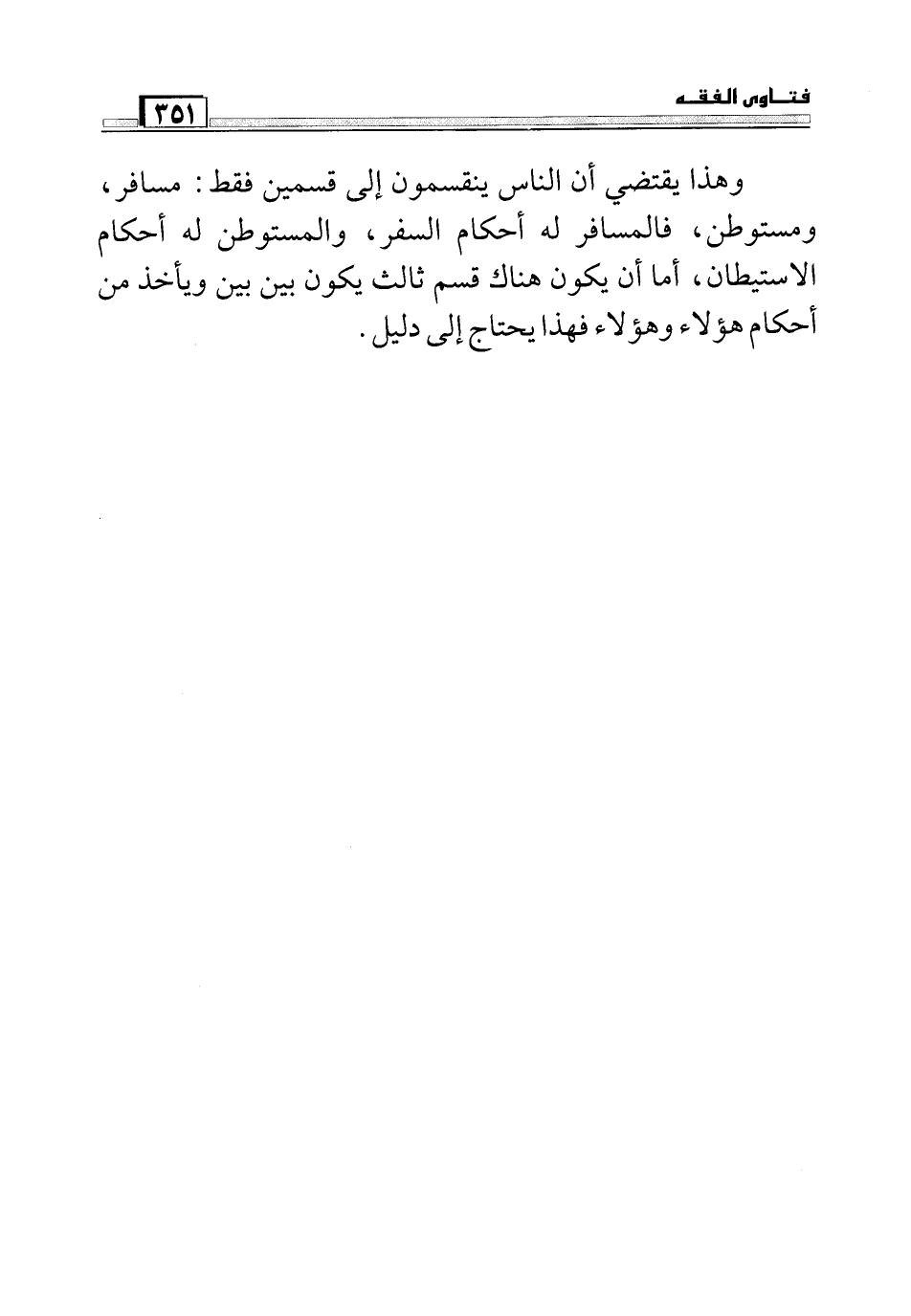 وهذا يقتضي أن الناس ينقسمون إلى قسمين فقط: مسافر ,ومستوطن ,فالمسافر له أحكام السفر, والمستوطن له أحكام الاستيطان, أما يكون هناك قسم ثالث يكون بين، بين ويأخذ من أحكام هؤلاء وهؤلاء فهذا يحتاج إلى دليل.